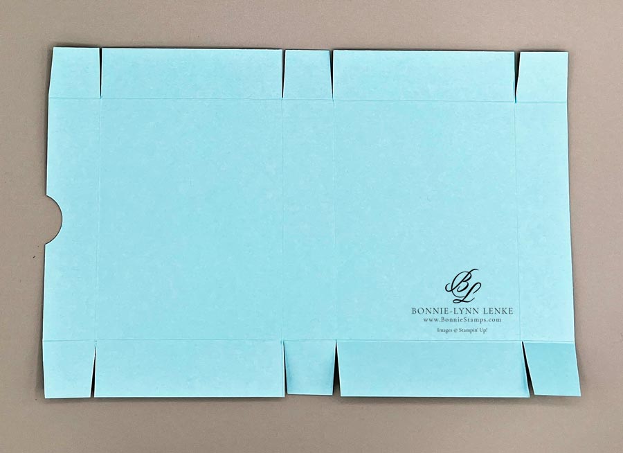 - Balmy Blue: 6-1/2” x 10”, score at 1” on all 4 sides then 4-1/2” & 5-1/2” on the long side (Box)