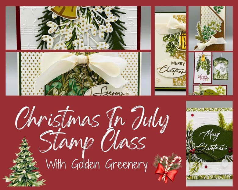 Did you miss my YouTube Live video class yesterday? You can still watch it on YouTube. The video link is below. Keep reading until the end for information on Bonus Days and my online Christmas In July Golden Greenery Stamp Class. Would you like a FREE CHRISTMAS IN JULY CARD KIT?  From now until July