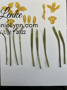Daffodil Daydream Bundle, Art Gallery or Plentiful Plants Stamp Set, DSP and Card Stock as noted above, Brushed Brass Butterflies embellishment, Old Olive ink pad, Glue dots, 2 sided tape or Stampin Seal, Dimensionals, Tasteful Label or Stitched Rectangle Framelets, Stampin Cut & Emboss Machine, Take Your Pick tool, Paper Trimmer, Bone Folder, Glue, Silicone Craft Sheet, Stampin Pierce Mat. Extra stamp set and framelets where for the greeting.