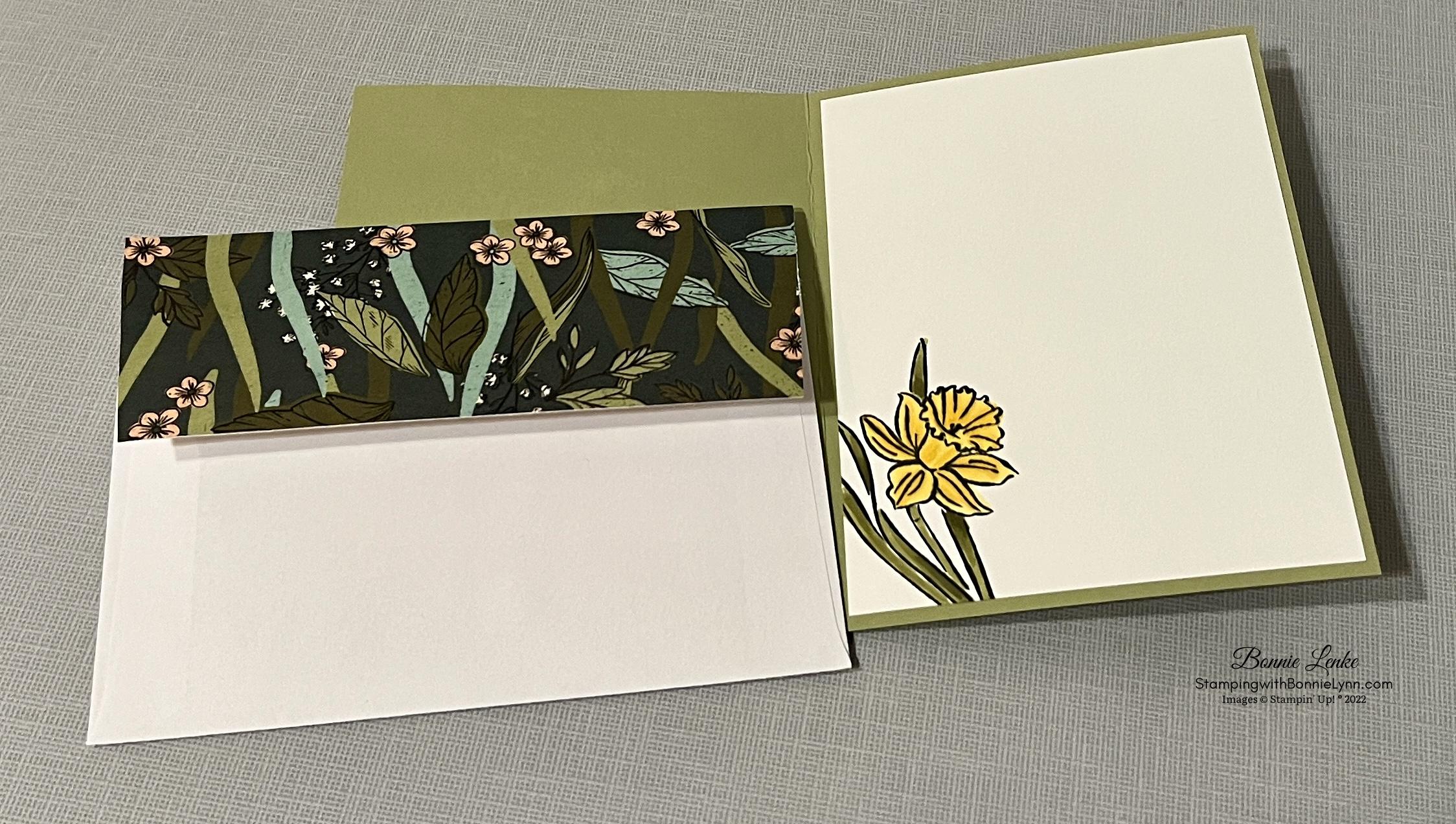 For the envelope I decided to add a piece of the Daffodil Afternoon designer series paper to the back flap with liquid glue. I then trimmed off any excess paper on the sides. You could also stamp an imagine on the front corner of envelope and color with your Stampin Blends. If you do remember to put a piece of paper on the inside so the ink doesn’t go through to back side.