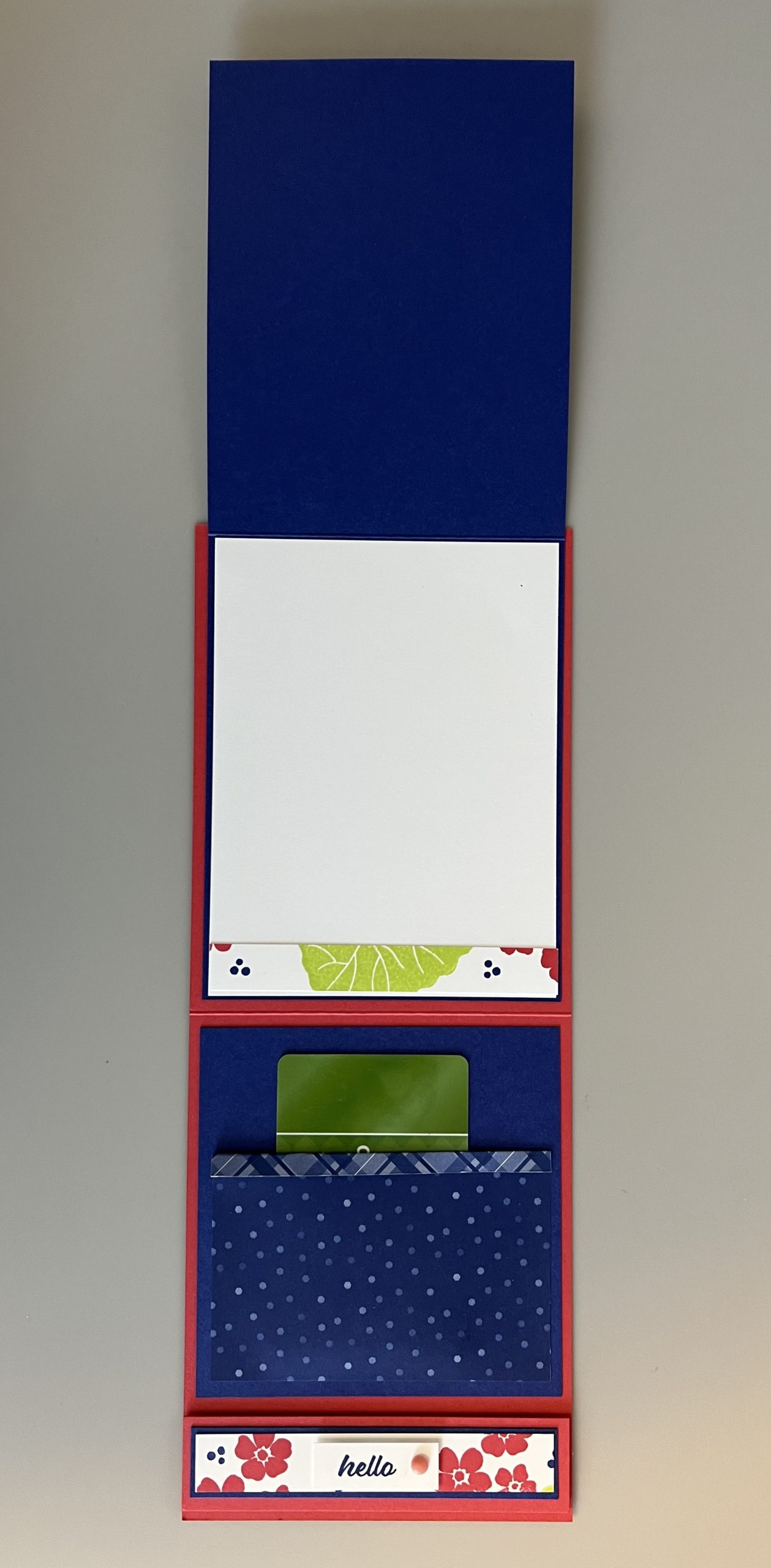 10. Fold the Starry Sky DSP on the score line and glue the ¼” in place. Adhere to Starry Sky making sure you put your tape to the edge to leave room for a gift card or money. If you don’t want a gift card holder then decorate this area with DSP, Basic White stamped with another greeting as desired, or leave blank.