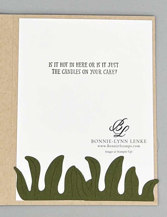 - The Garden Green Cardstock is used for cropping the 2 fern leafs and the two longer skinny leafs (you need 3 of these). Add to card front using Mini-Dimensional and/or Glue Dots.