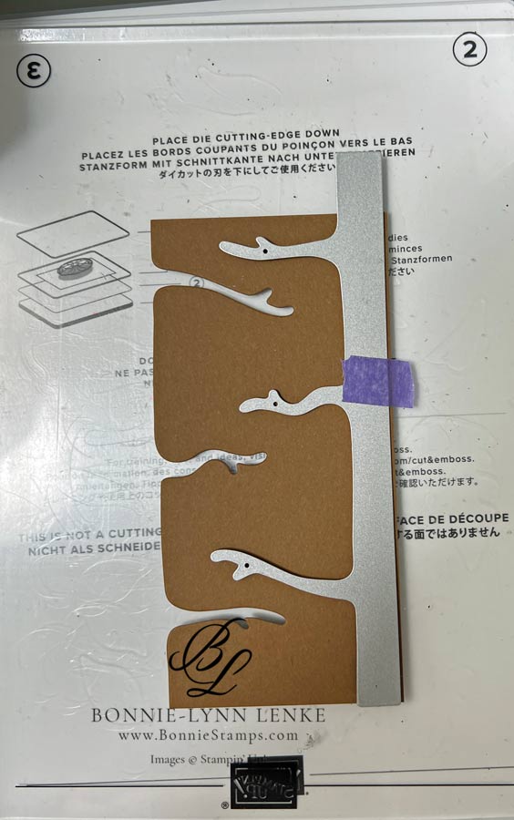 - Crop 3 or 4 of the 2 single leaf dies from Old Olive Cardstock (the leaves dies are two separate sizes), add to card front along the trees with Glue Dots.