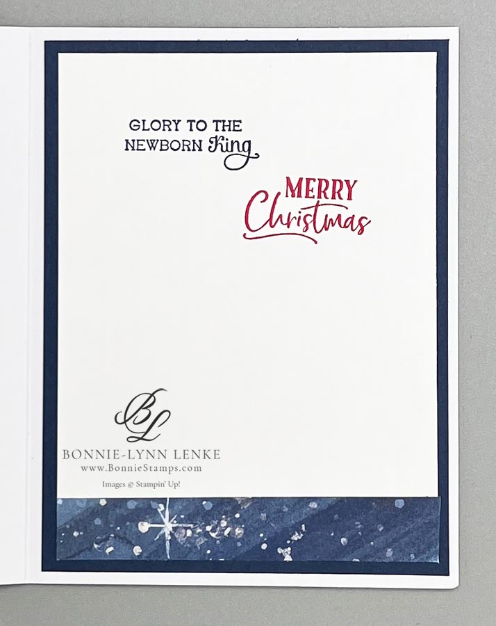 7. The inside was completed by stamping the saying from the Brightest Glow stamp set in Night of Navy Ink onto White Cardstock. Attached a strip of Designer Series Paper to bottom of cardstock. Adhere this panel to a panel of Night of Navy Cardstock then add to inside.