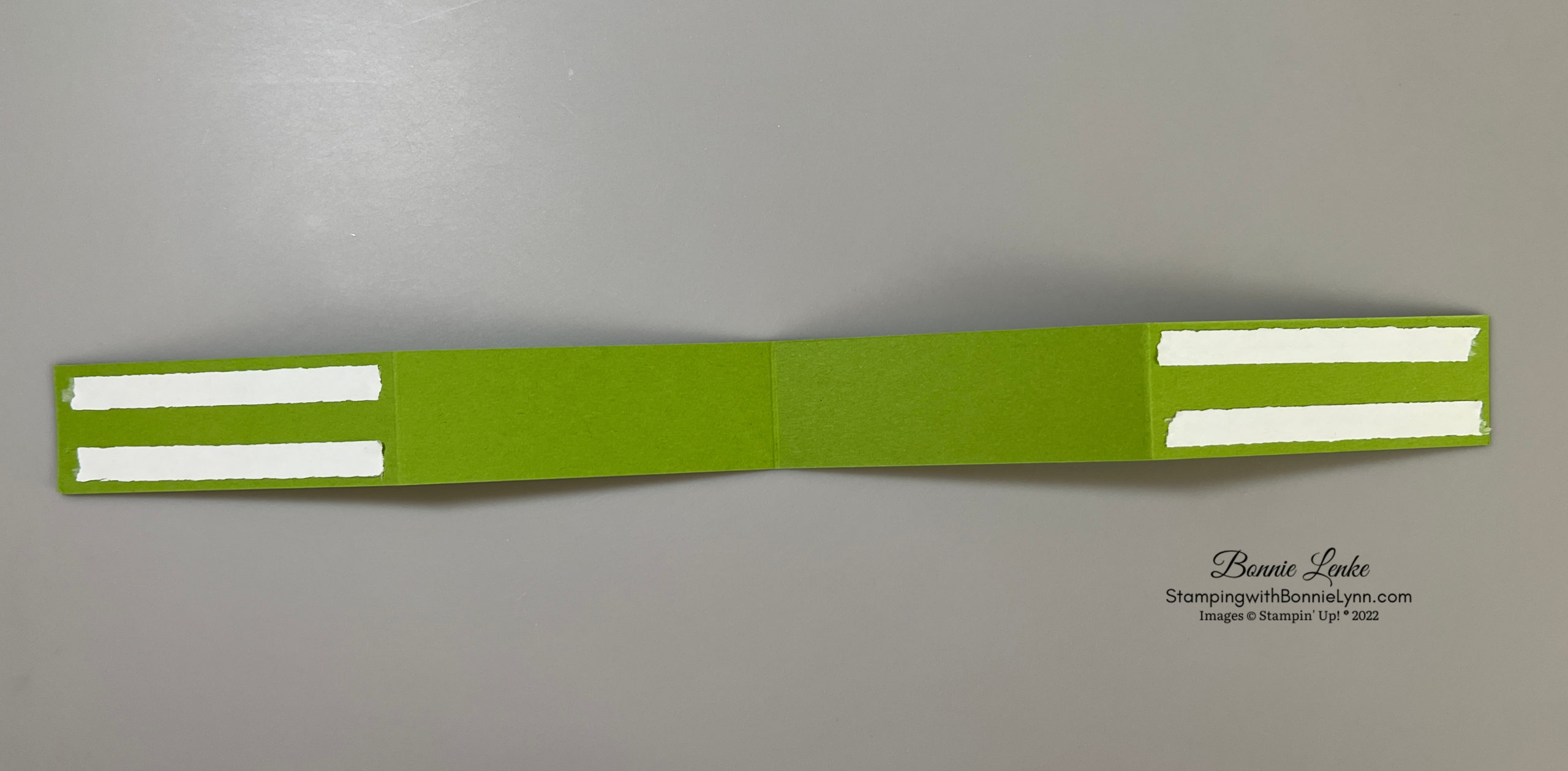 Adhere the Granny Apple Green strip by placing adhesive only on the far left and far right “scored sections”. Click on the green strip above to see tape placement. Remember that the center “pops out”. Line up the center score line with the center fold of the card.
