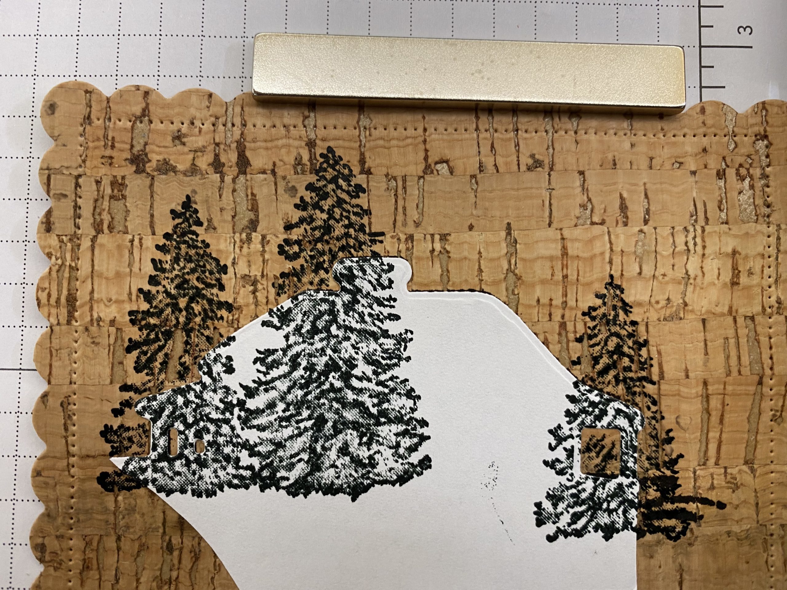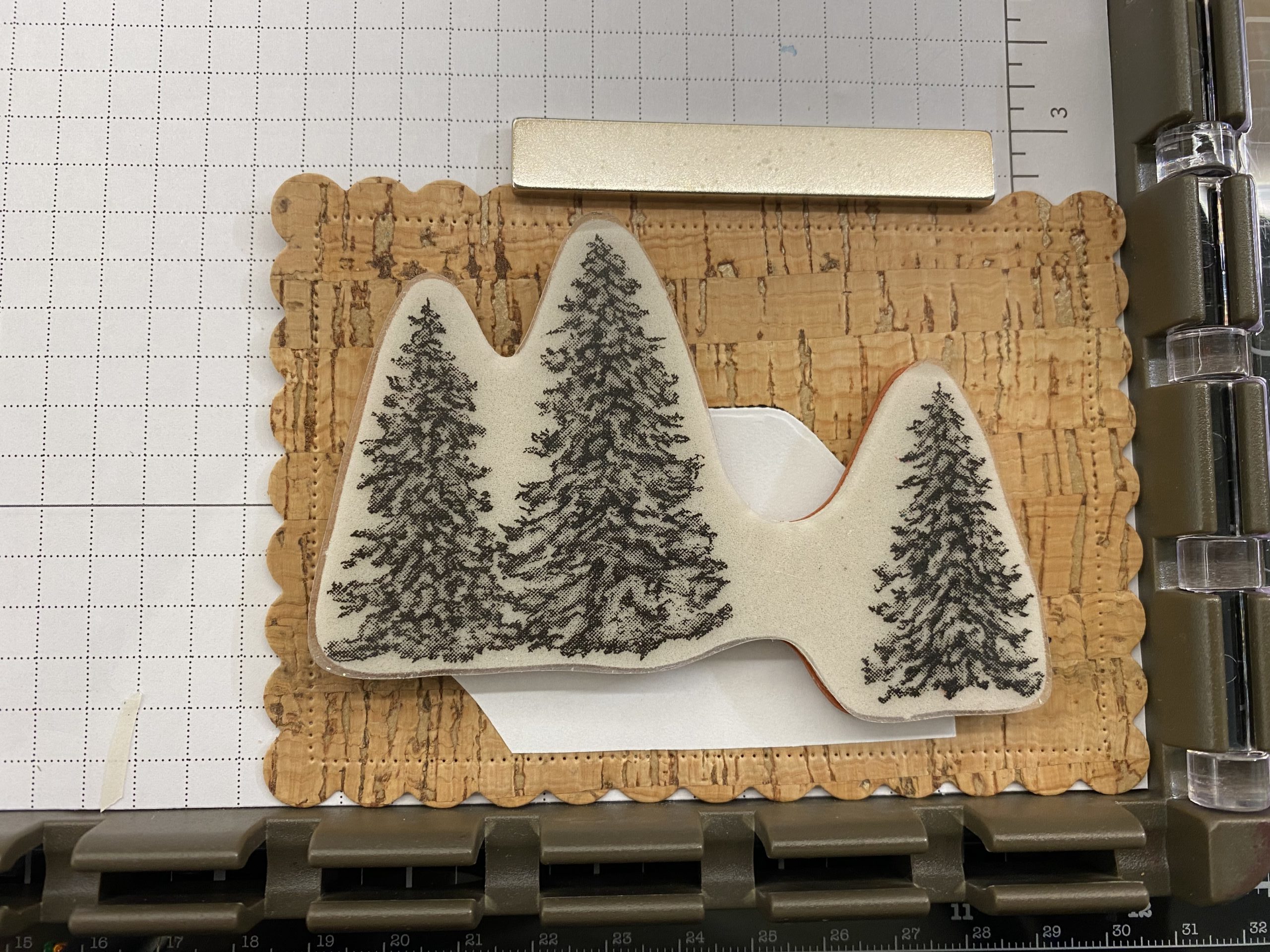 - Stamp the cork with the cabin stamp from Peaceful Cabins Stamp set in Early Espresso Ink. When stamping on cork you will need to reink the stamp 2 or 3 times to get a clear, darker image (Cork absorbs the ink), using the Stamparatus. Cut a mask using your Peaceful Cabins Dies and place it over the stamped cabin imagine. Using the tree stamp and Evening Evergreen Ink stamp the trees over the cabins and your mask will protect the cabin imagine from getting inked. Your mask can be regular masking materials which you can purchase on Amazon or use paper, such as Post It Notes, with removable double sided tape placed on the underside of your cut mask. I did let the ink dry real good after stamping the cabin and before stamping the trees.