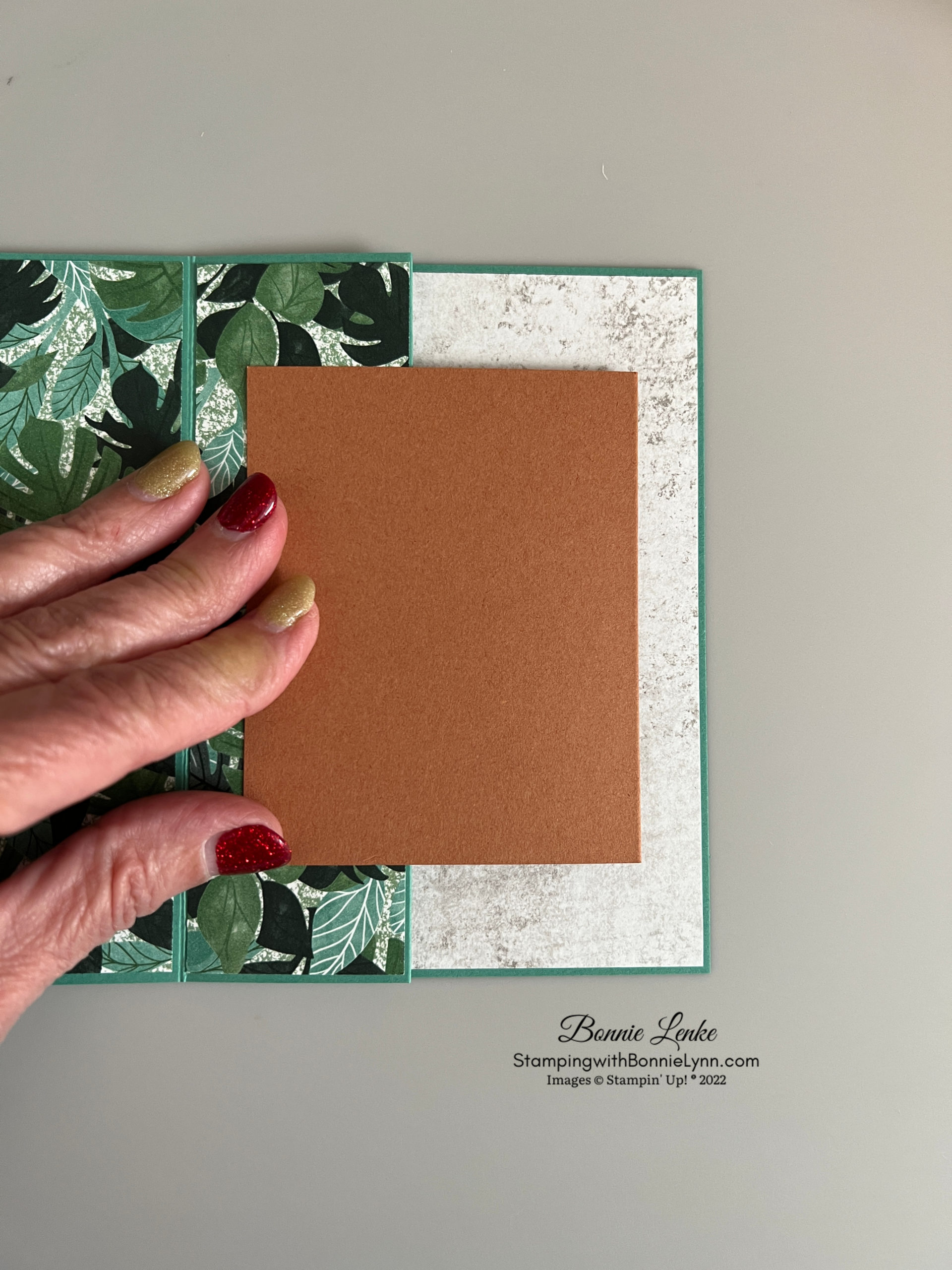 - Stamp greeting in Evening Evergreen Ink onto Basic White and leaves in Just Jade ink. Adhere to Just Jade card stock. Center this section and adhere to right side (section 5) of card base.