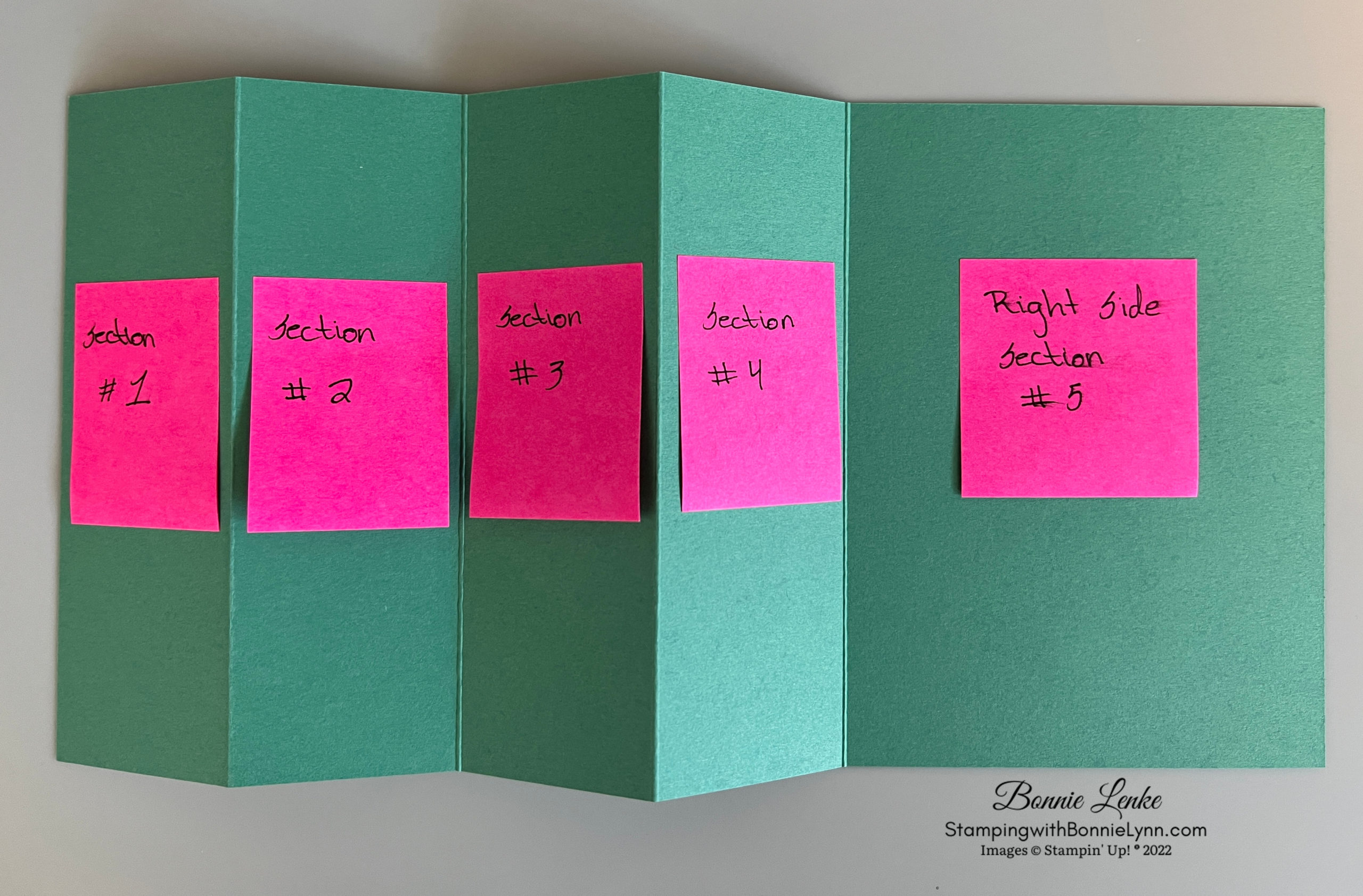 - Using the above Cinnamon Cider, adhere Stampin Seal or Tear and Tape to back side in two strips on the right side where it will attach to section 4. Lay this section directly over the Just Jade/Basic White section on right side of card base and then fold section 4 down onto tape.