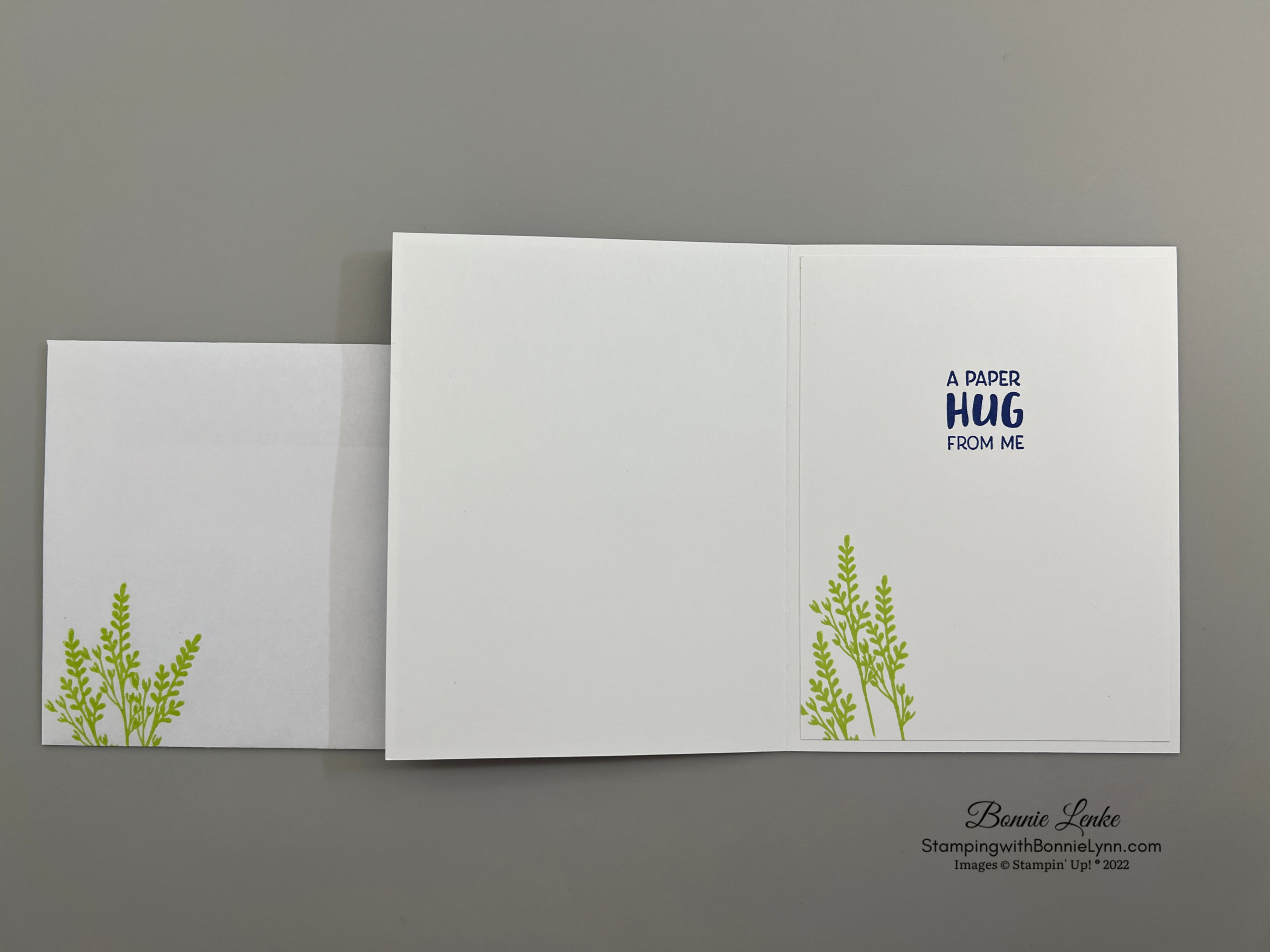 - Using the Starry Sky Ink stamp your greeting on Basic White cardstock for card inside. Using the flower on stems, stamp in Parakeet Party ink in the lower corner and also on the envelope front.