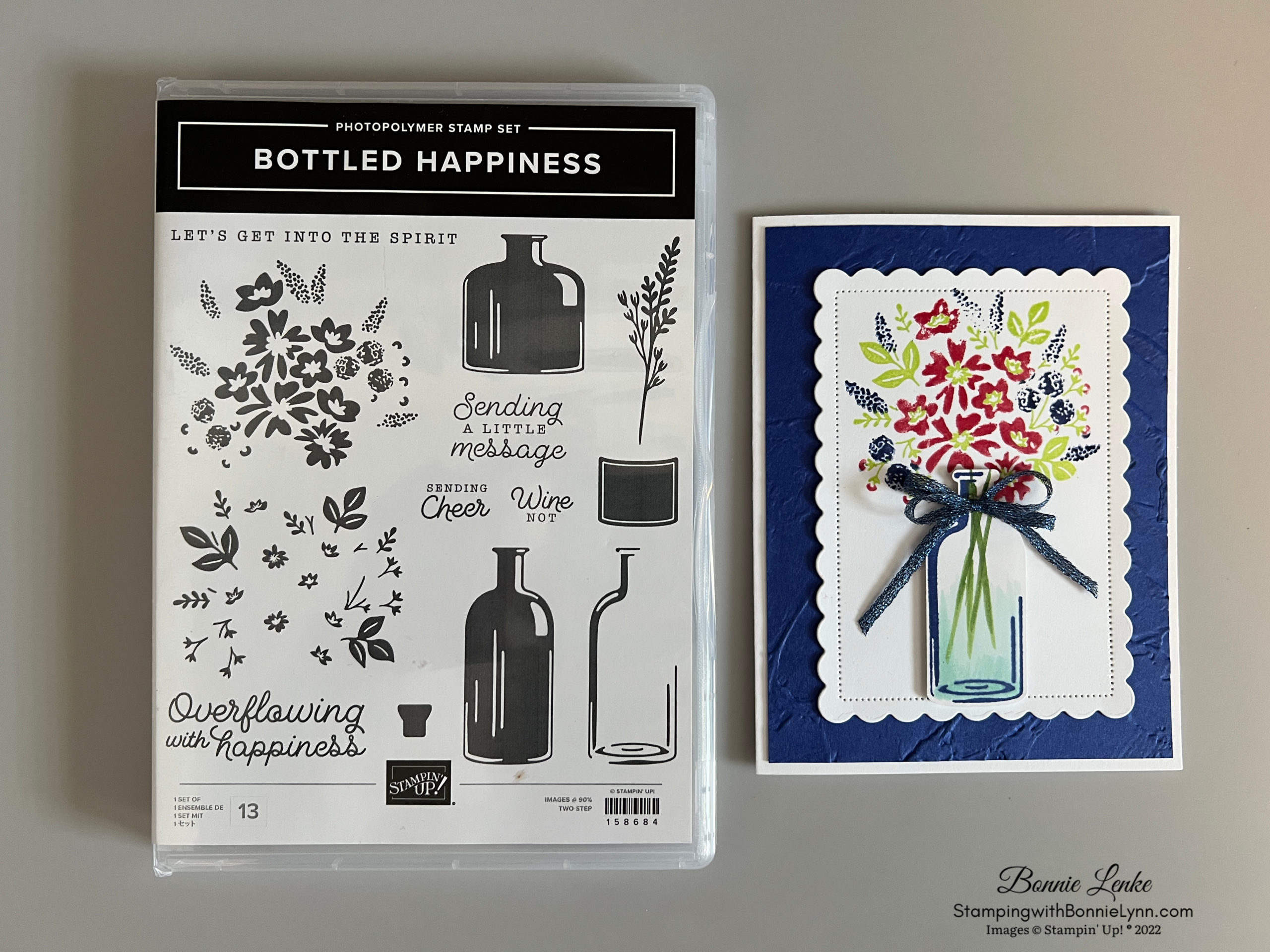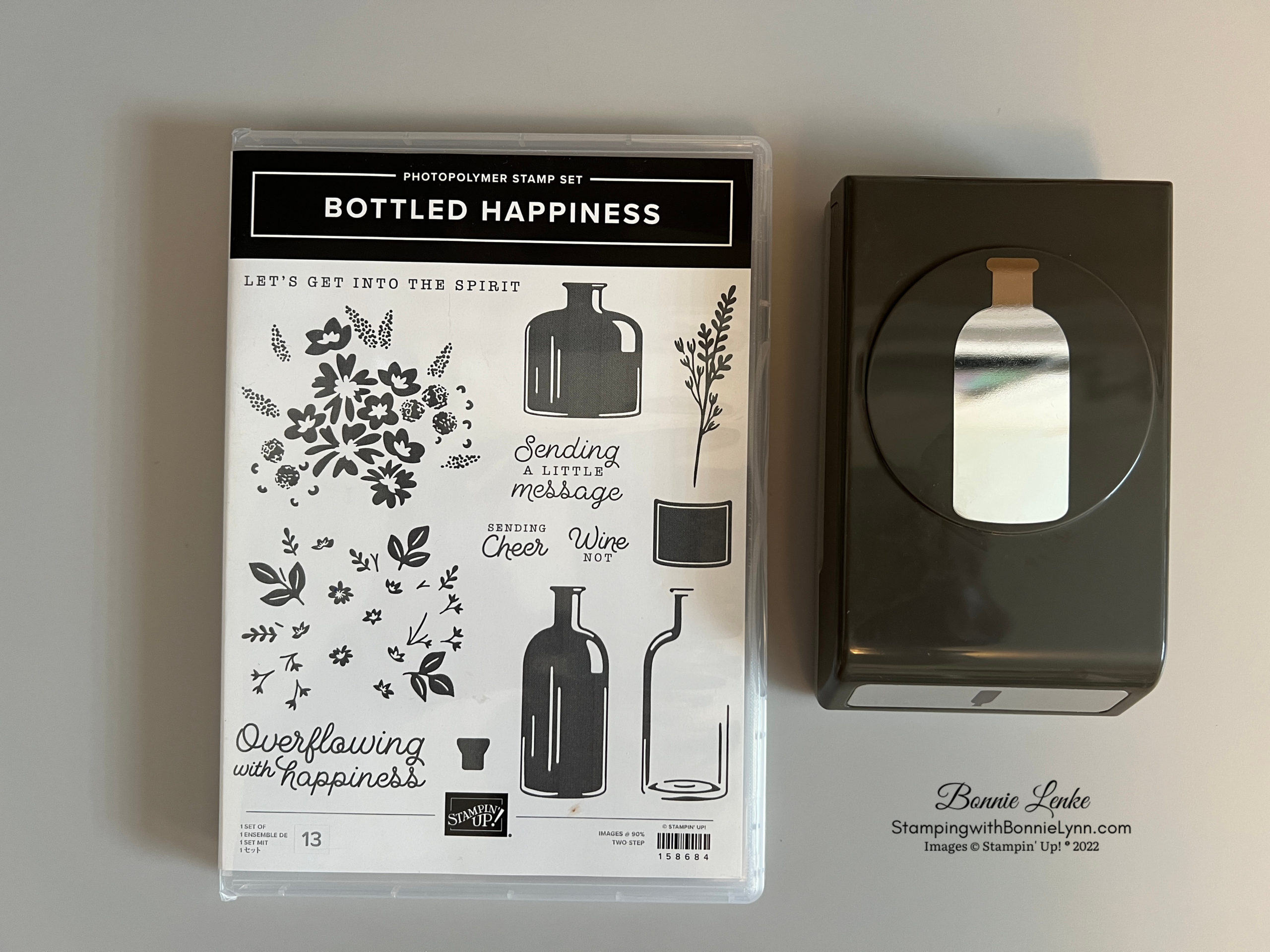Today I’m sharing the new Stampin’ Up Bottled Happiness stamp set and Bottle Punch that are in the new 2022/2023 Annual Catalog debuting on May 3rd. The flower stamp is a two step stamp. The flowers are one stamp and the leaves and flower center another stamp. You can ink the stamps with an ink pad or color them in with a Stampin Marker. I recommend using the Stamparatus when coloring stamps with markers and also when doing the 2 Stamp stamps. Lining up stamps is much easier with the ease of the Stamparatus. I did both as you’ll see in the instructions.
