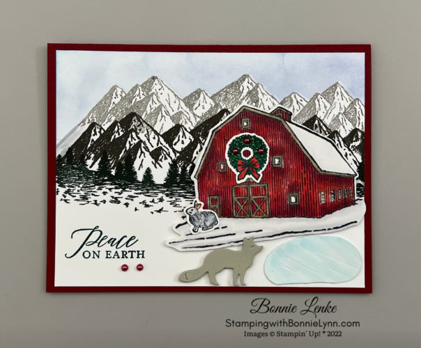 - Use Dimensionals to adhere Barn to card front. Add the wreath to the barn with Glue Dots.
