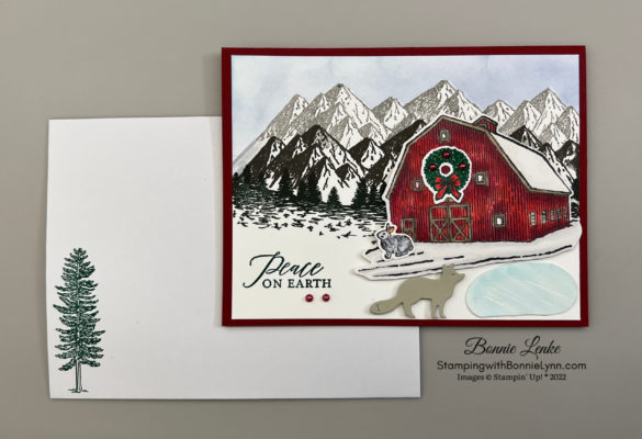 - The Envelope is stamped with the tree from the Christmas Barn stamp set in Shaded Spruce Ink.
