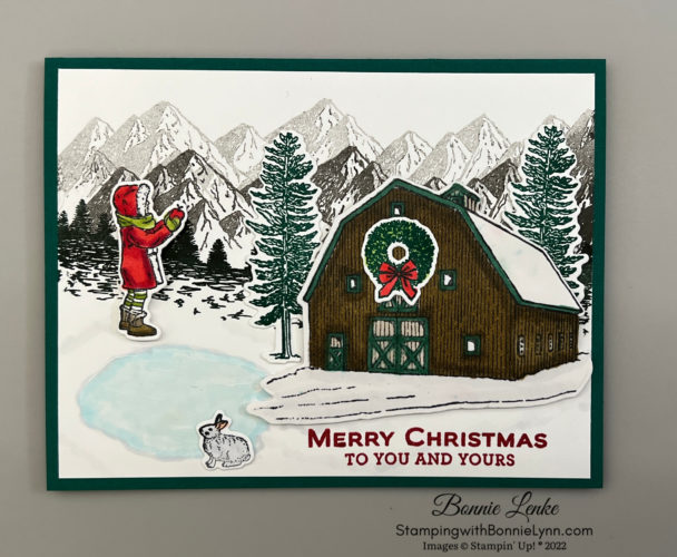 - Stamp the Barn in Memento Black Ink onto Basic White Cardstock and the wreath in Shaded Spruce Ink. It’s also a good time to stamp the rabbit from the Regal Reindeer bundle in Memento Black Ink onto white cardstock. Using Stampin Blends in Cherry Cobbler and Sweet Sorbet color the body of the Barn. The trim and doors are colored with Light Soft Suede. The rabbit was colored using Smoky Slate and the Blender Pen. Petal Pink for the inside of the ears. (Hint: After adding a small amount Smoky Slate to the Rabbit I picked some color up off the light Smoky Slate with the Blender Pen for blending on the rabbit. Using the same technique add some very light Smoky Slate around the ground of the barn (it’s to make it look like snow drifts). I also used this same technique on the pond with the Balmy Blue to obtain a much lighter blue color). I colored the wreath with the Light Granny Apple Green Blend to add more dimension to the wreath. Color the wreath ribbon with Sweet Sorbet Blends. Cut out all 3 pieces with their co-ordinating dies.