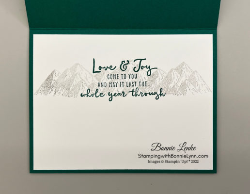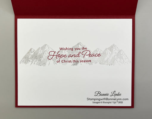 - For the card inside I stamped the Mountain Air mountains in Early Espresso Ink after stamping off two times. The saying is from the Hope and Peace stamp set and stamped in Cherry Cobbler Ink onto White Cardstock.