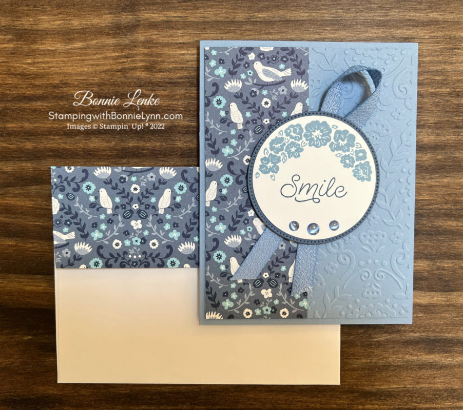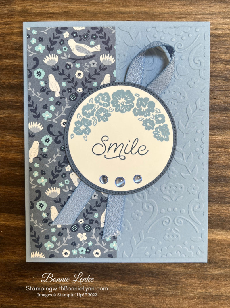 Today’s card for you is the Stampin’ Up! Circle Sayings Smile card. This a lovely stamp set and works with the new 2-3/8 Circle Punch. It also features the new Countryside Inn Designer Series Paper. This paper is very versatile.