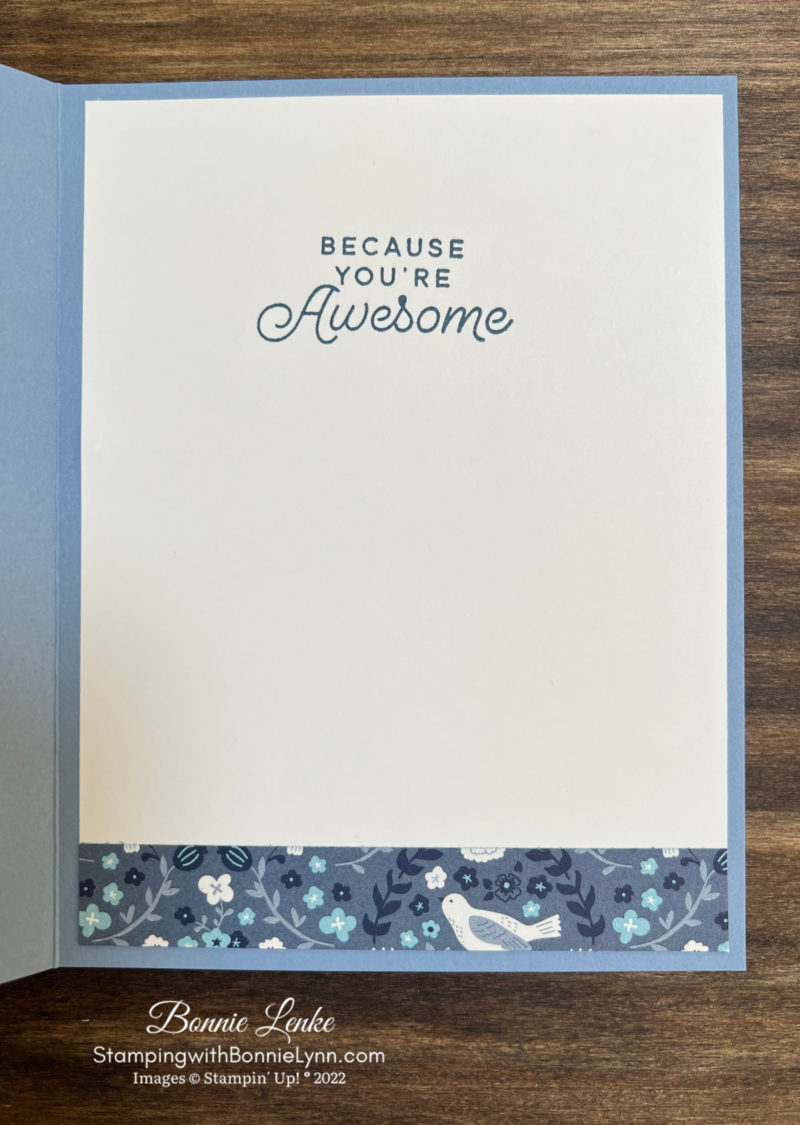 - On the inside stamp the saying in Boho Blue Ink and adhere a piece of Designer Series Paper to bottom of White Cardstock.