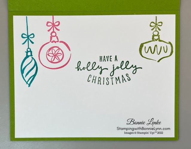 - The card inside was made by stamping each of the three ornaments in Bermuda Bay, Polished Pink and Granny Apple Green Ink along the top of Basic White Cardstock. Stamp the saying, from Christmas to Remember stamp set, in Garden Green Ink between the ornaments.