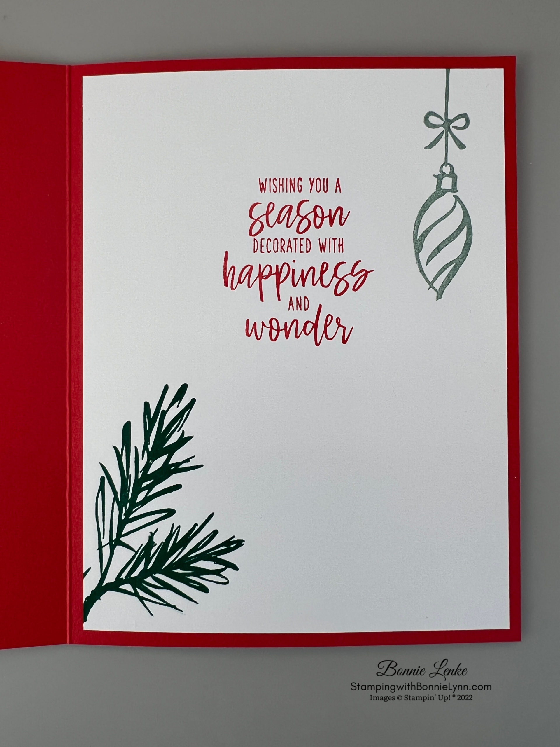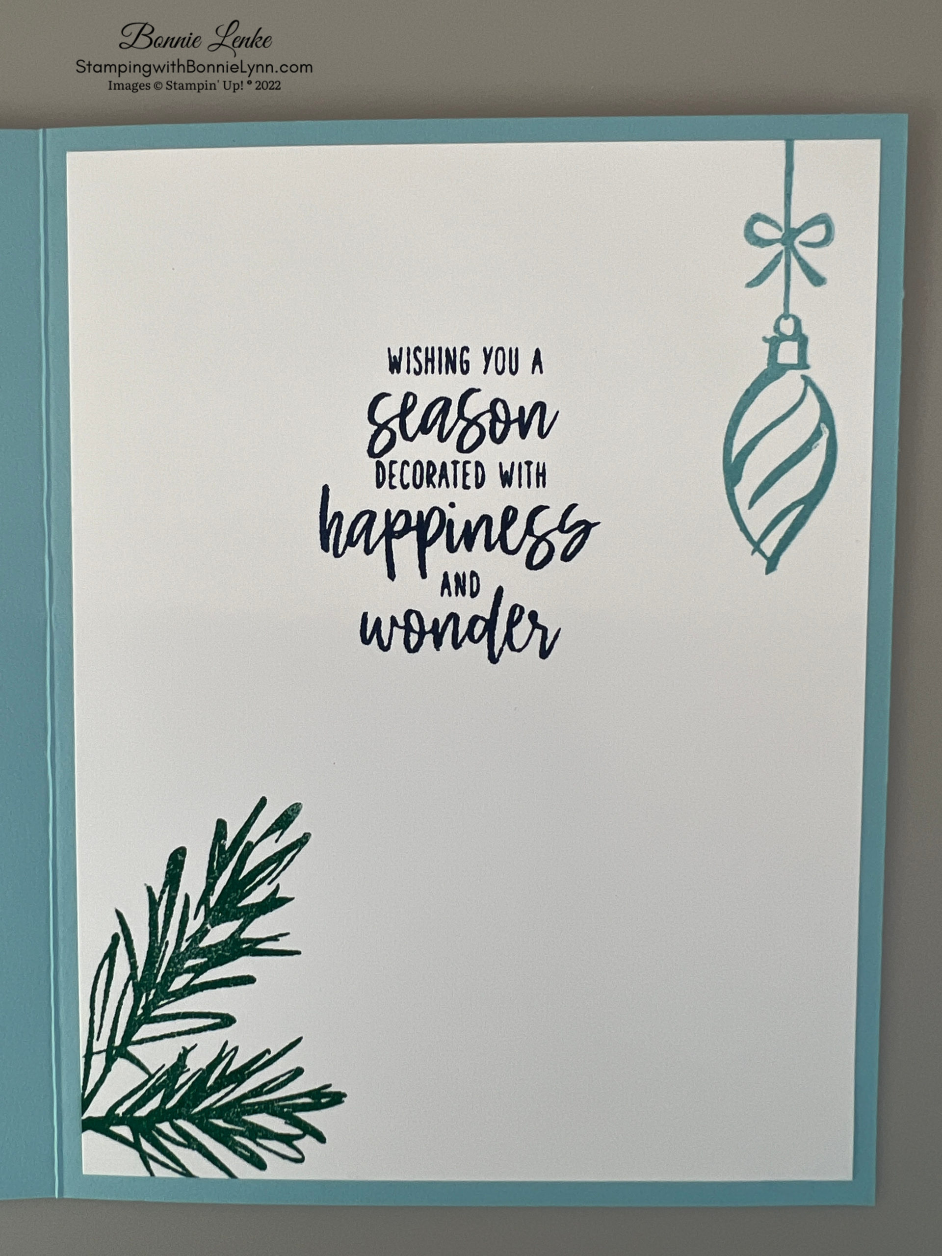 - For the card inside stamp part of the branch in Shaded Spruce Ink on the bottom left corner. Stamp the greeting in Night of Navy on the same White Cardstock. Stamp an ornament on the top right-hand corner in Balmy Blue Ink.