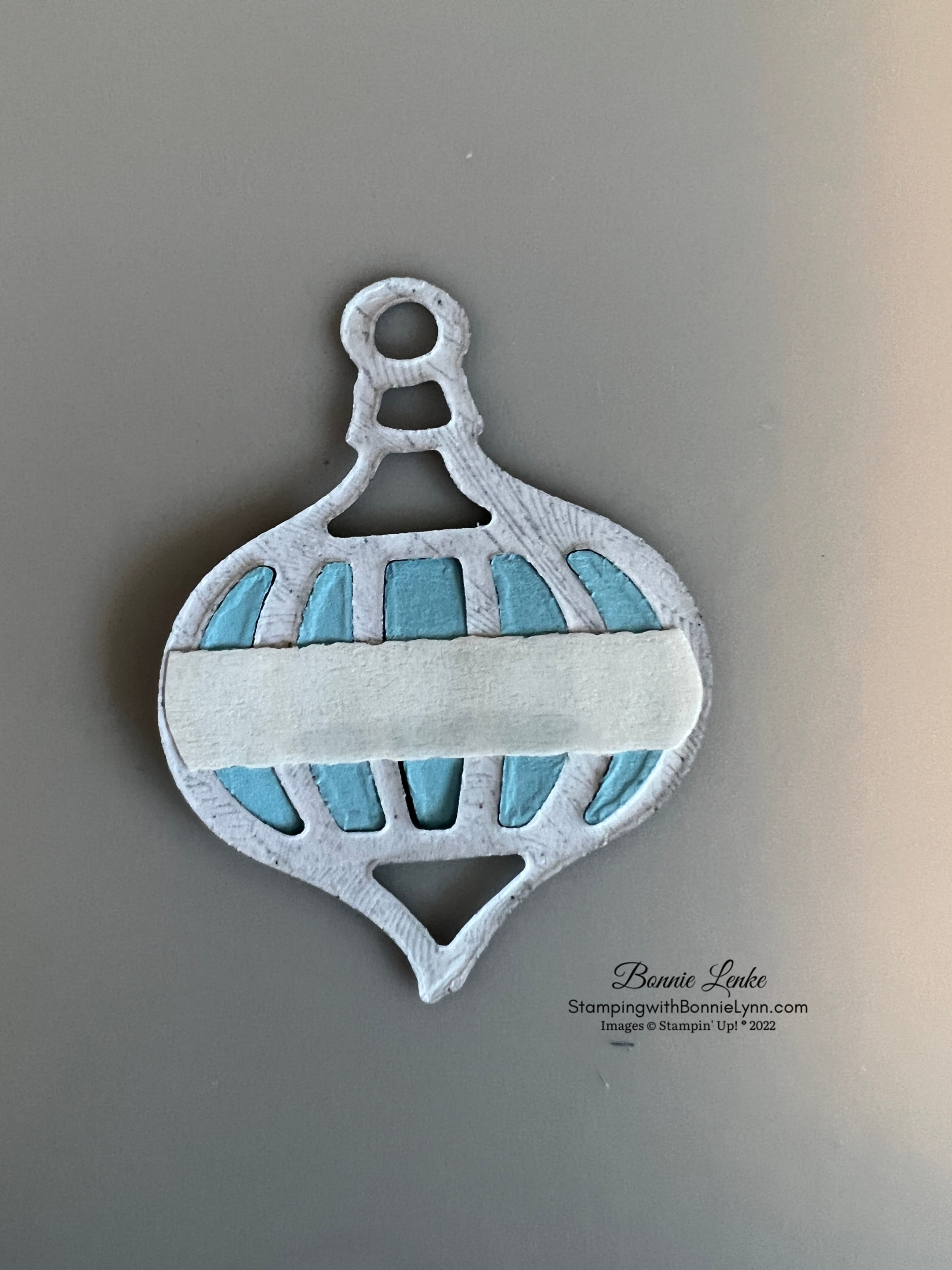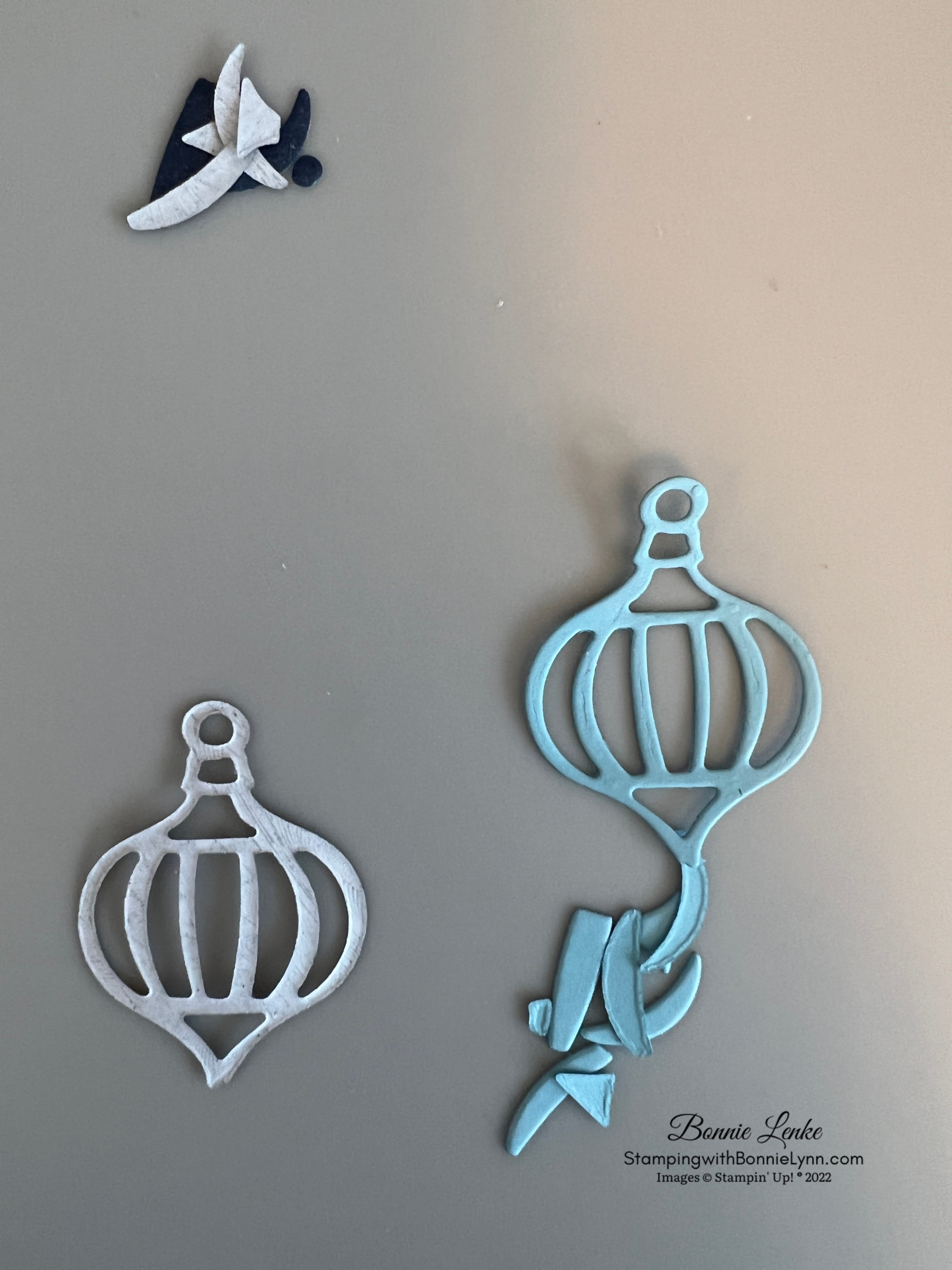 All the Cut Pieces Adding the Balmy Blue Completed Ornament Add Tape First then the Pieces Two Reverse Ornaments - Slide the ornament over the branch using the top hole you left empty. If you used the adhesive on the back of the branch before cutting out then take it off and adhere it to card front, otherwise use liquid glue to adhere to card front. Use a Glue Dot to hold the ornament in place on card front.