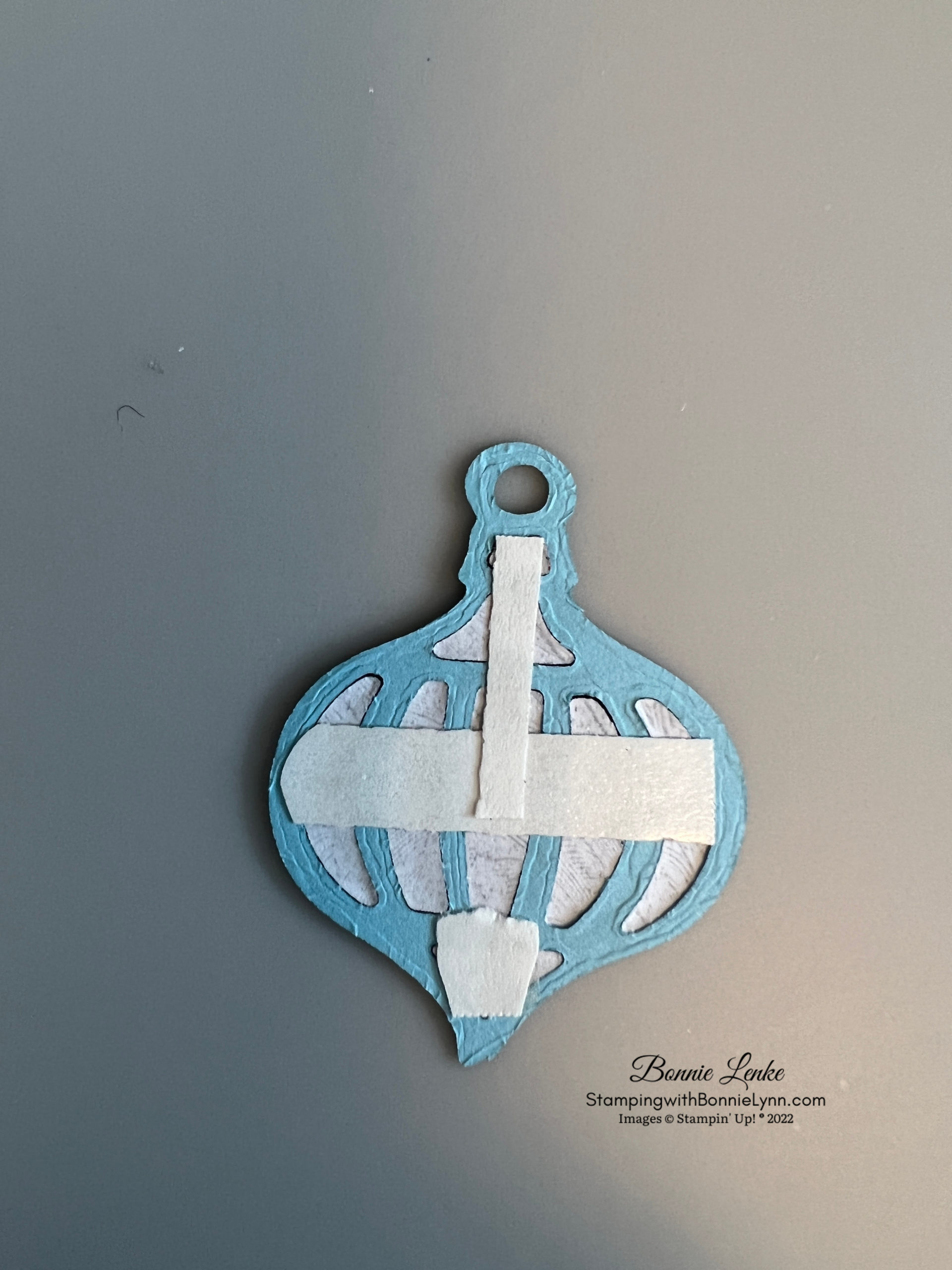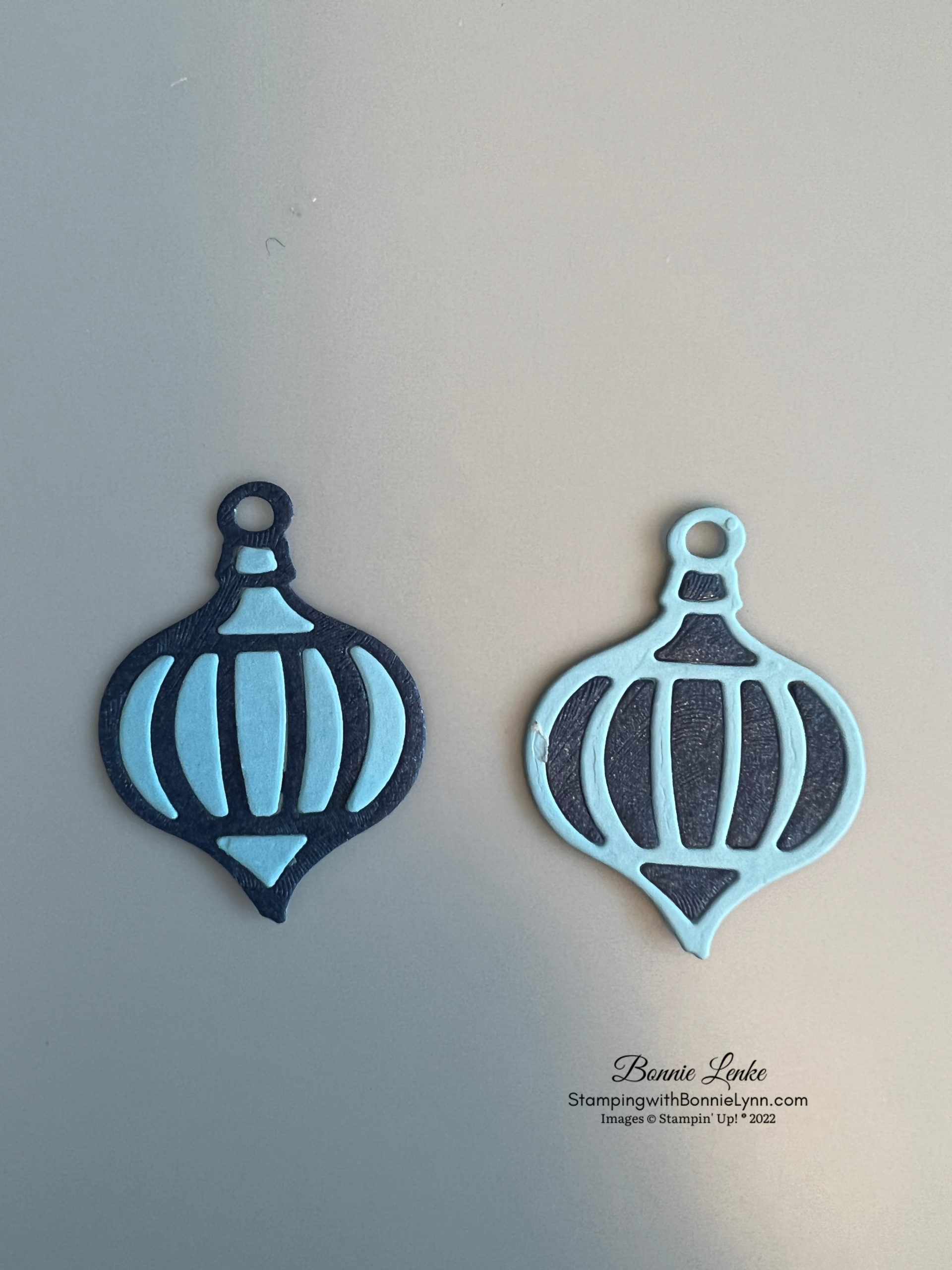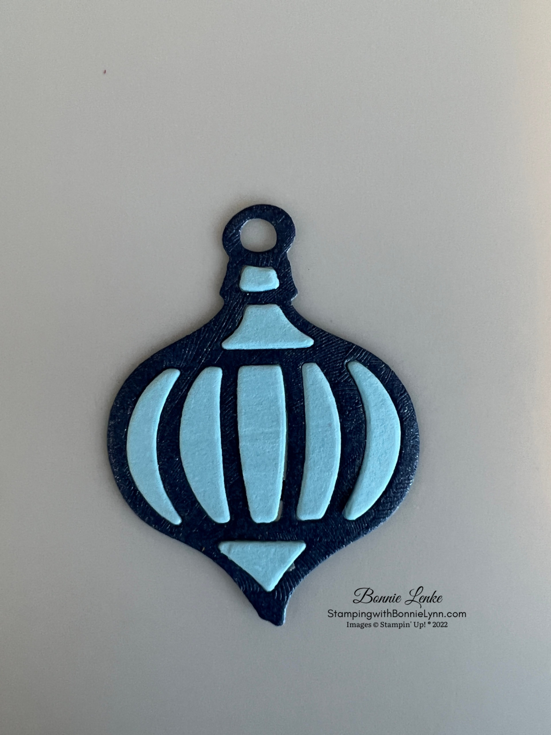 - Pick which ornament you want and cut out of the Night of Navy Brushstroke DSP. Cut a second one out of Balmy Blue Cardstock. Working from the backside place the cut-out pieces of Balmy Blue into the Night of Navy Ornament. Leave the top-hole empty. Tape them into place. After I completed these instructions I determined that it was easiest to add the tape to the back of the cut out ornament then turn it over and add all the Balmy Blue little piece. Your Take Your Pick tool is an excellent helper for this task with the sticky end.
