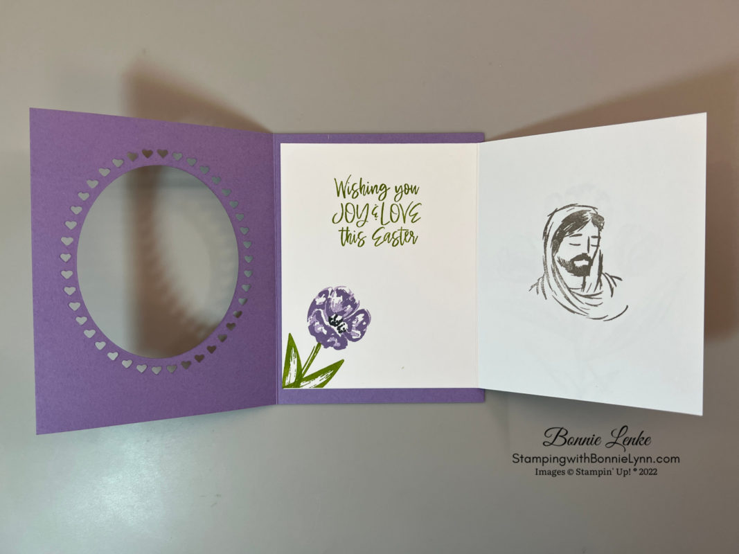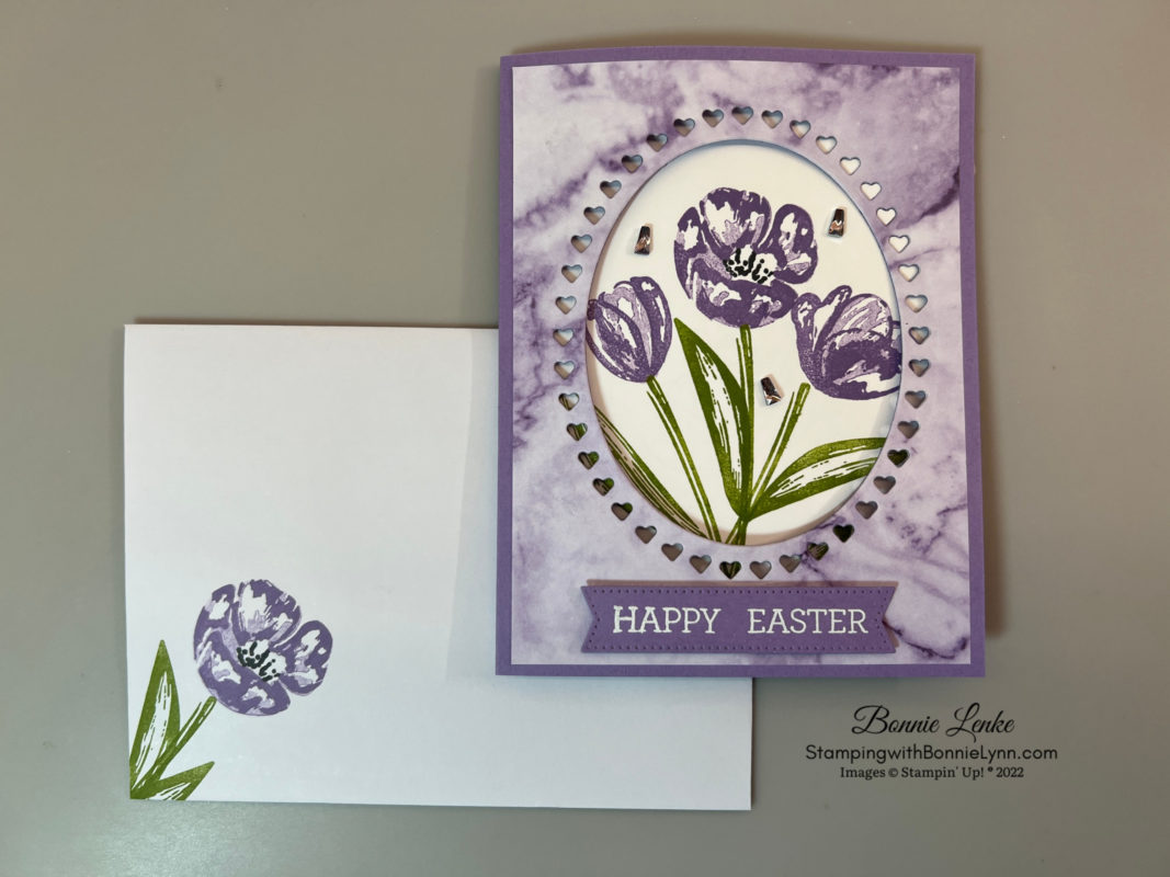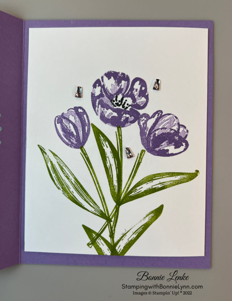 Stampin’ Up! Flowering Tulips stamp set was fun to use for this beautiful fun fold card. My three favorite colors for Easter Cards are Purple, Pink and Yellow. This one is Highland Heather and who knows what other color(s) might appear before Easter.