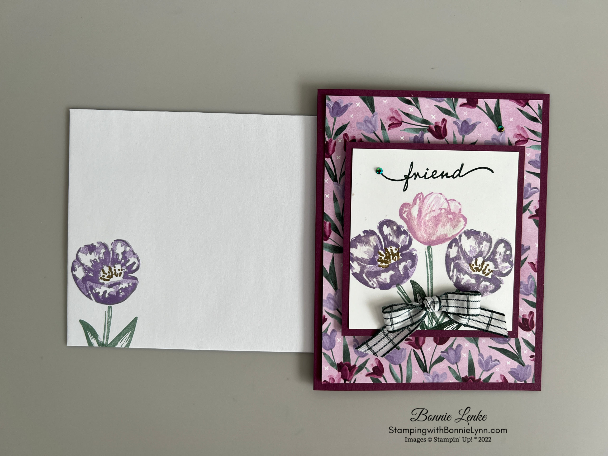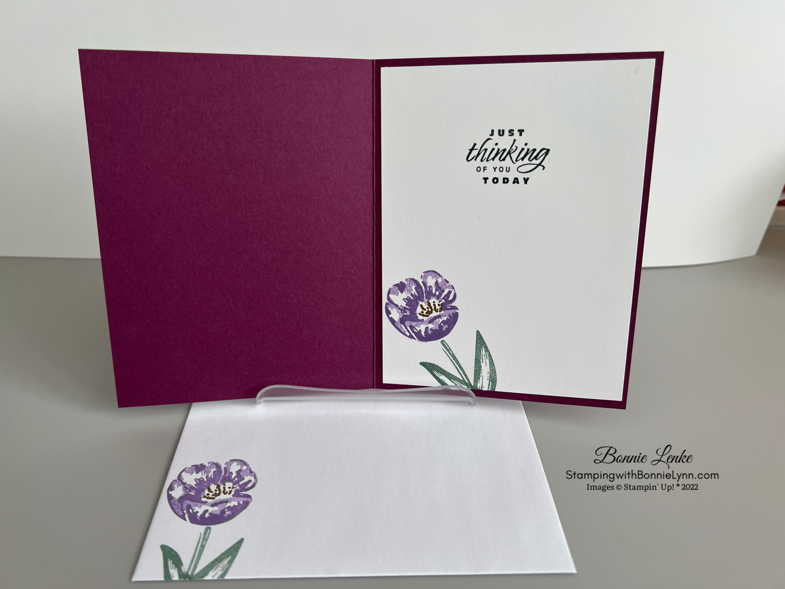 - While you’re stamping flowers go ahead and stamp on the White Cardstock for the inside in Highland Heather with the Soft Succulent for both the stem and leaf. The inside sentiment if from the Flowering Tulips Stamp Set in Evening Evergreen Ink. Stamp the same flower on the envelope front.