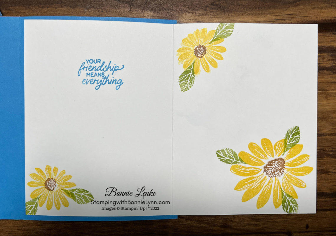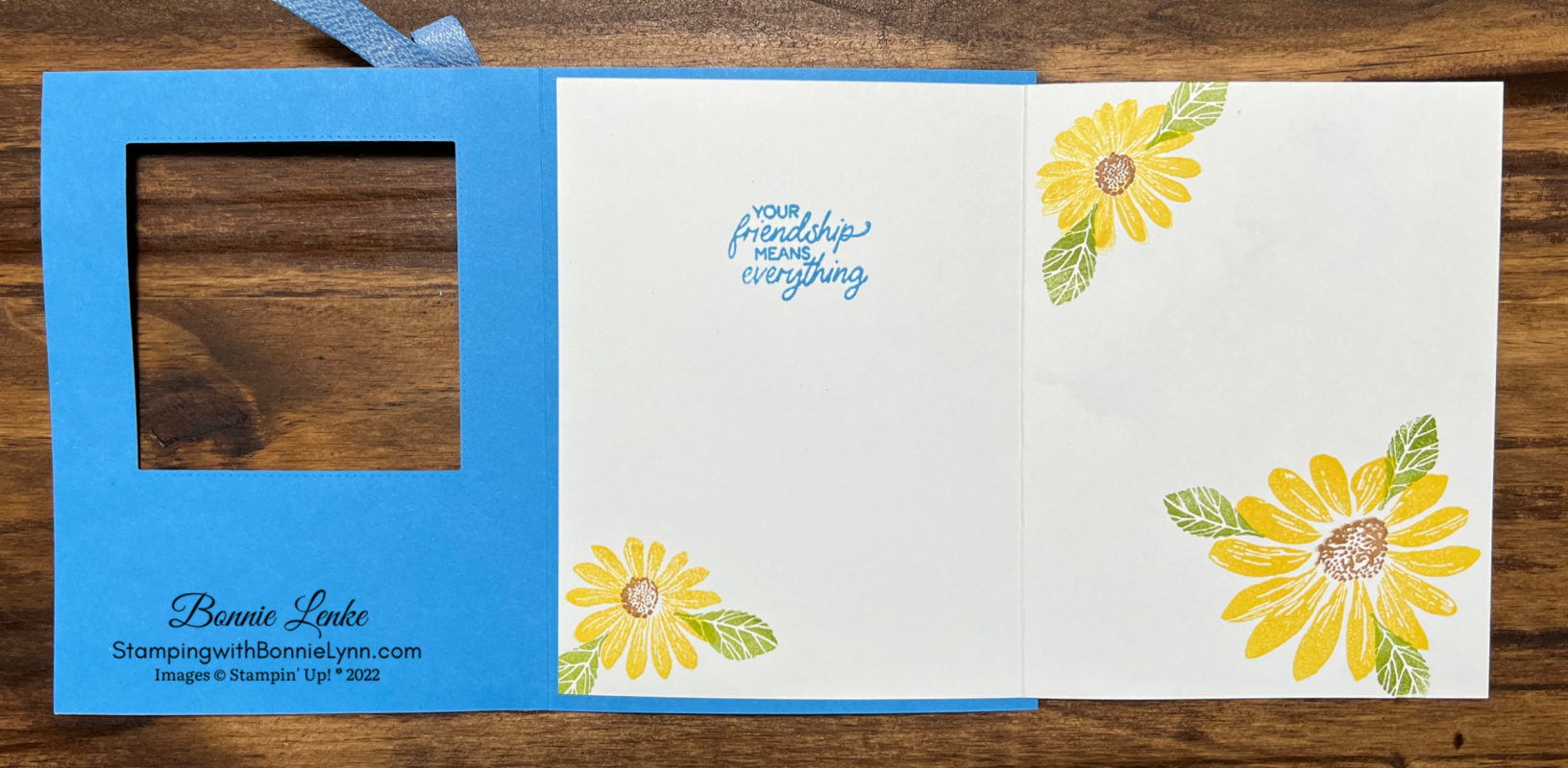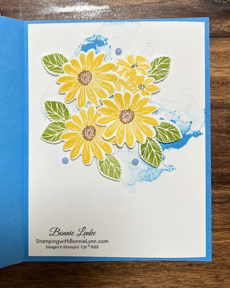 - Stamp the large daisy flower in Daffodil Delight on the inside bottom right hand corner (see picture below) and the small daisy in the upper left hand corner of the right half and again on the bottom left corner of the left side. Finish the center dots of daisies by stamping with Pecan Pie ink. Stamp leaf in Granny Apple ink and greeting in Azure Blue ink. Adhere to inside of Azure Blue card base with the fold on the right side.