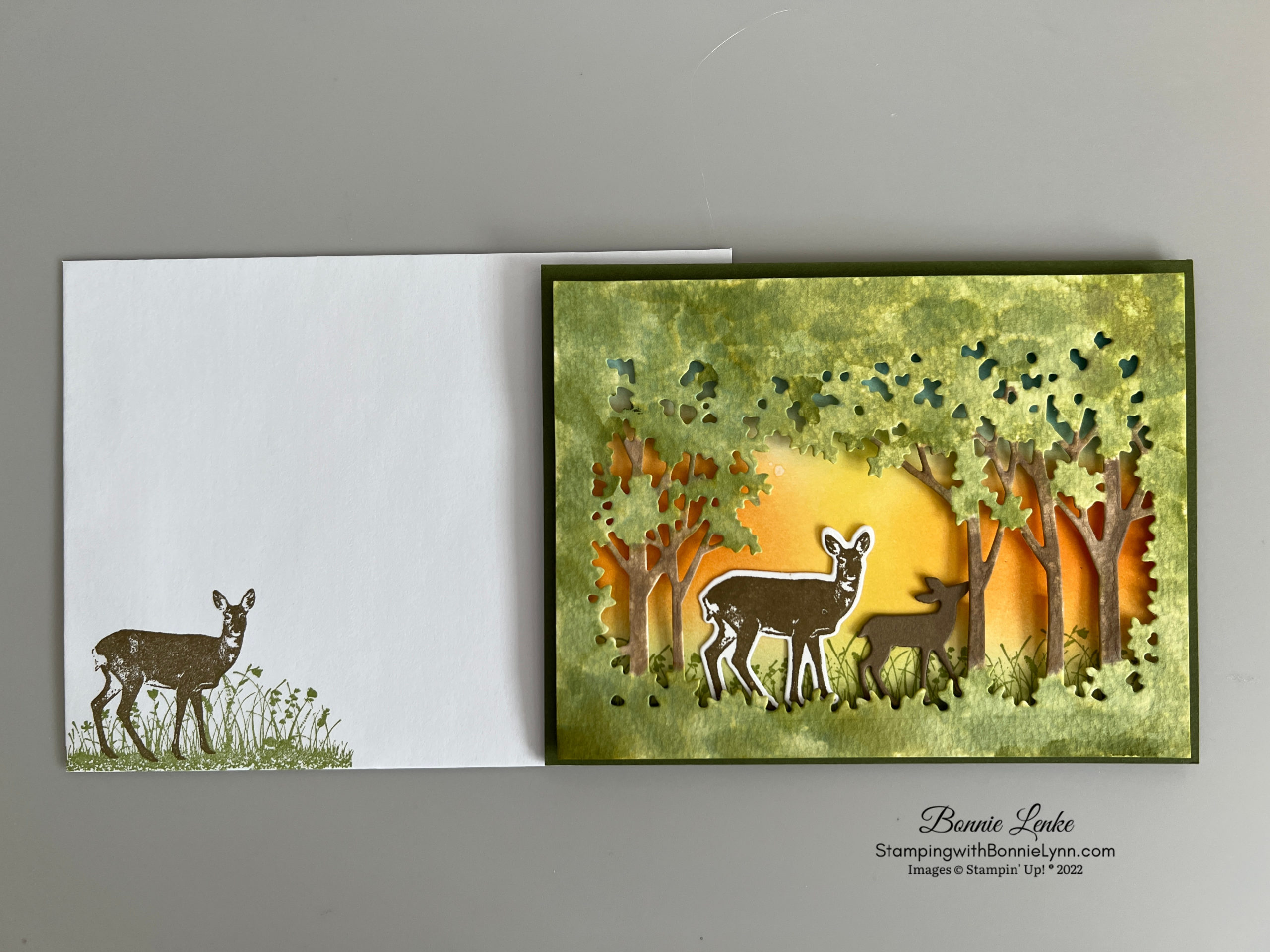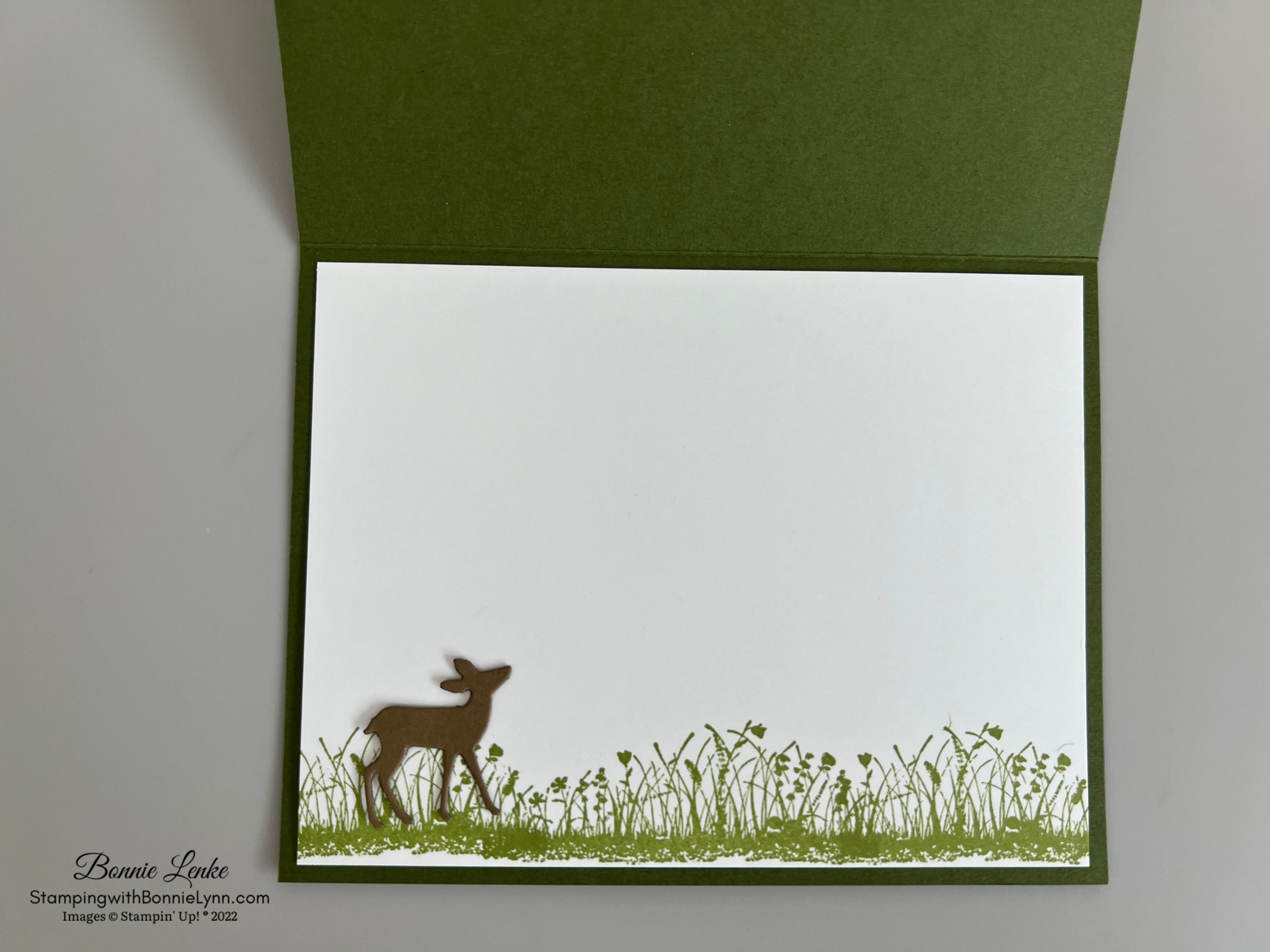 6. Stamp larger deer in Soft Suede Ink on White Cardstock and die cut out with coordinating Grove Die. Cut little deer out of Soft Suede Cardstock. Also stamp the larger deer in the grass on your envelope lower left-hand corner.