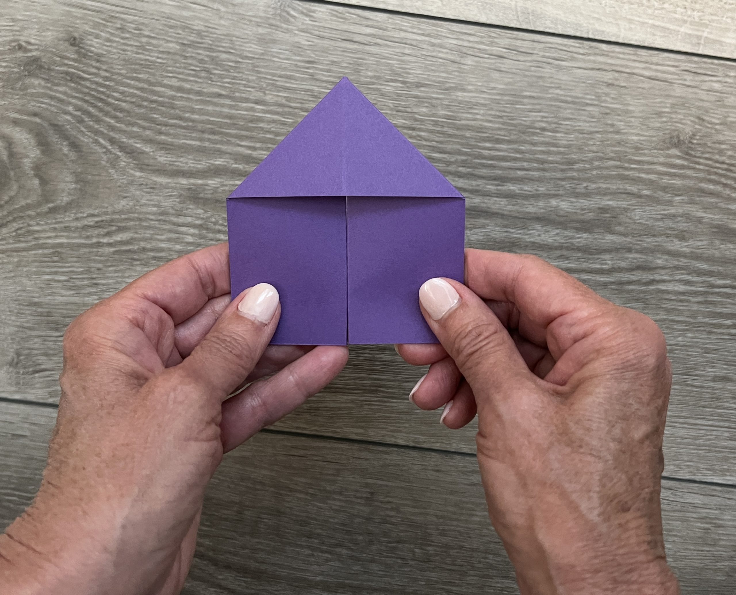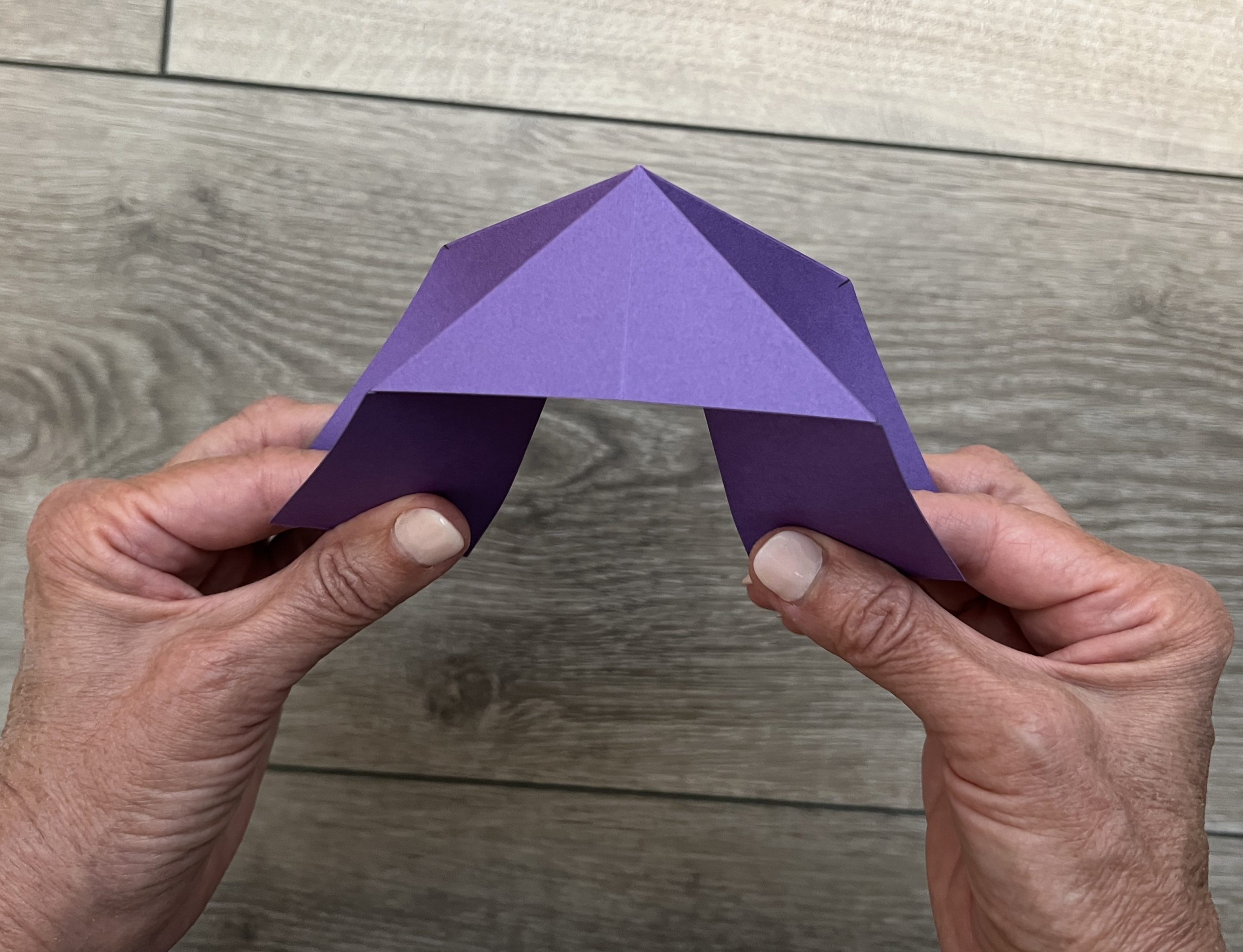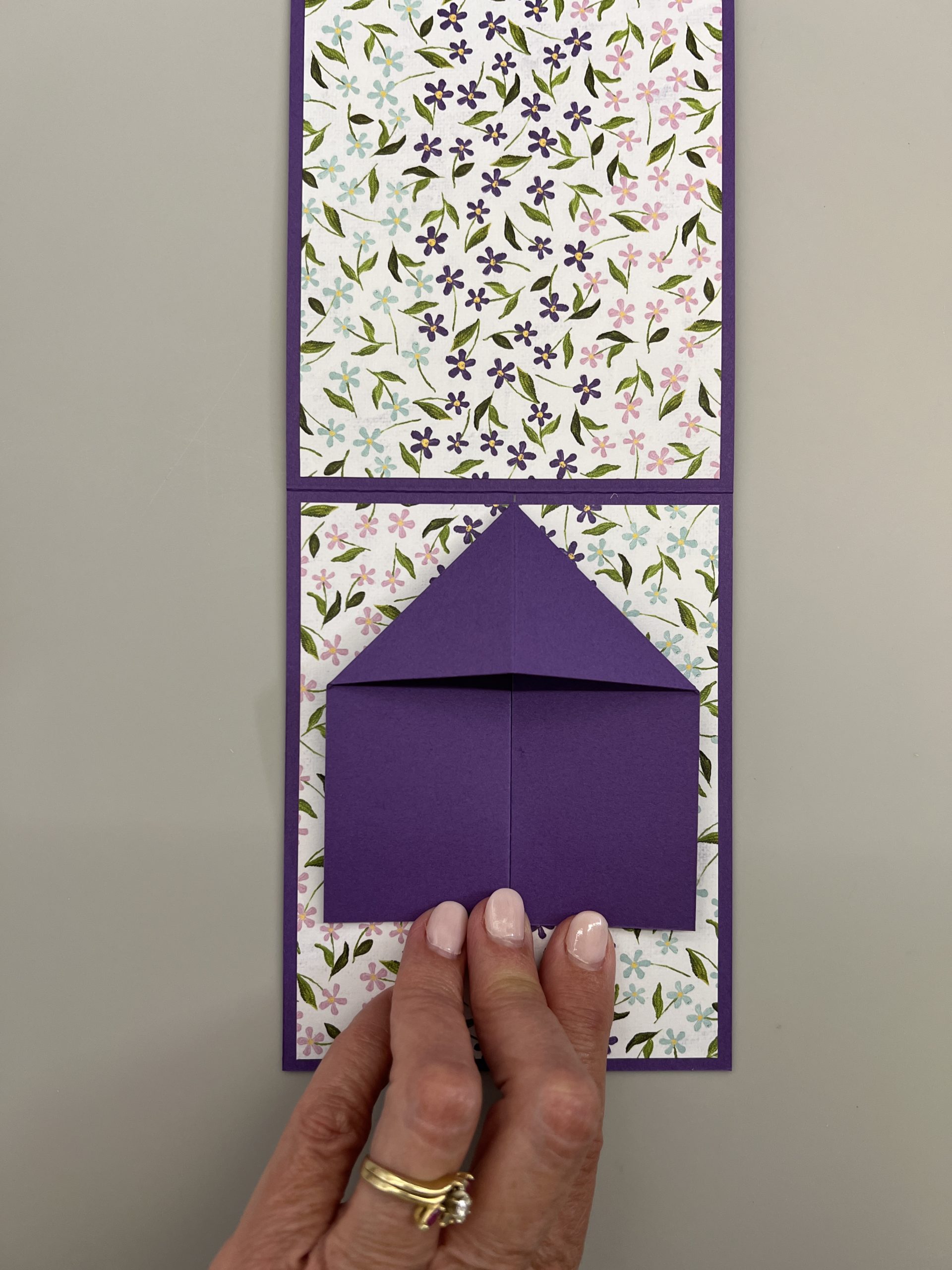 - Turn the card over, apply liquid glue to the triangle shape and close card. Apply pressure or weight to card to hold in place for a minute or two while it dries.