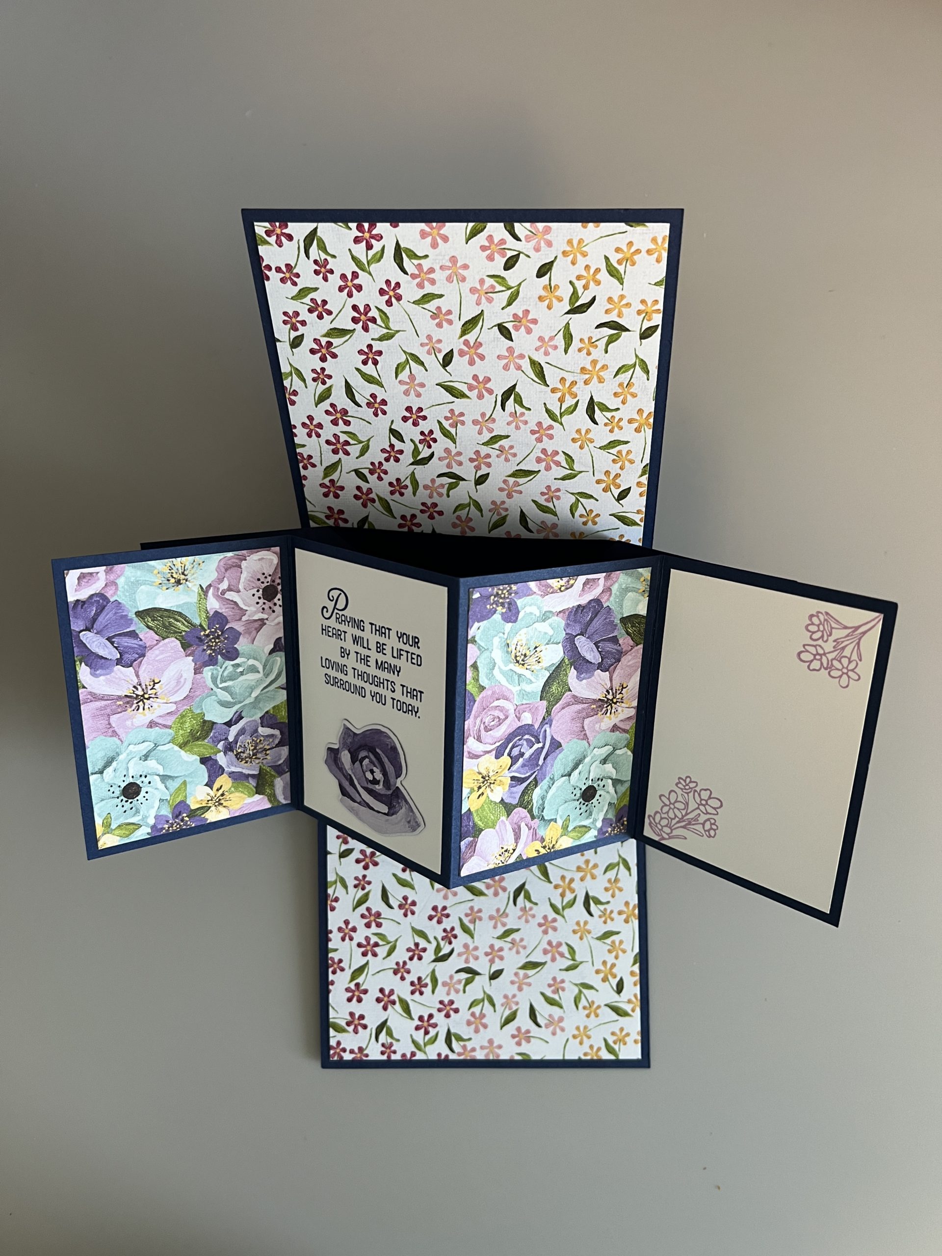 What a WOW card this one is! The Hues of Happiness Designer Series Paper is gorgeous on its own but using it for this Fun Fold card made it POP all the more. Any stamp set or paper will work for this card, my choice was the Stampin’ Up Happiness Abounds stamp set with the Blossoming Happiness Dies. With the Hues of Happiness DSP, I was able to cut flowers out of the paper with the coordinating dies. I just love how easy Stampin’ Up makes it for us. Don’t be scared by reading the instructions to make this card. The hardest part is folding the cardstock so that the mechanism works properly. To do this I give you step by step pictures and a video. It is not a complicated card to make. I suggest making a sample out of old cardstock and write measurements and notes on it for future cards. I like to do this with all my Fun Fold cards.