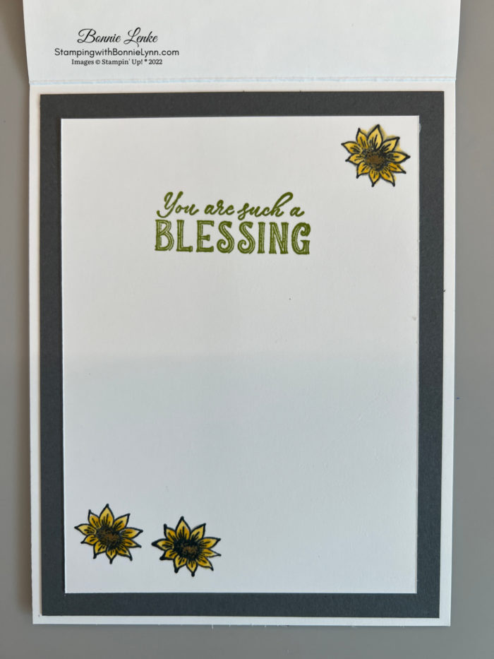 - The inside of card is finished by adhering a Basic Gray Panel to inside. Using the White Cardstock that you stamped and colored the little Sunflowers on in Step 1, Stamp your Saying in Old Olive Ink. Adhere to Basic Gray Panel.