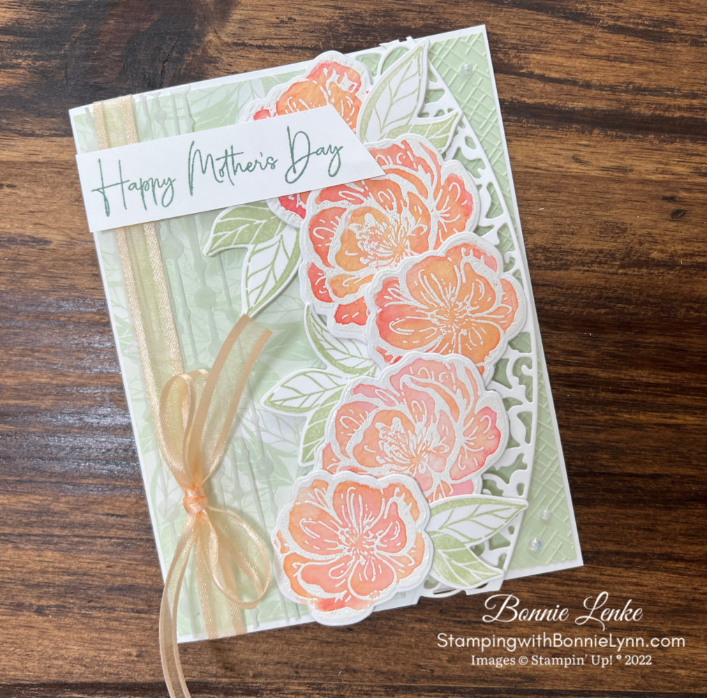 Stampin’ Up! Irresistible Blooms, an online exclusive is stunning. For this card I did some heat embossing and water coloring to make this beautiful card. Read on for directions on how to make this card or better yet watch the video.