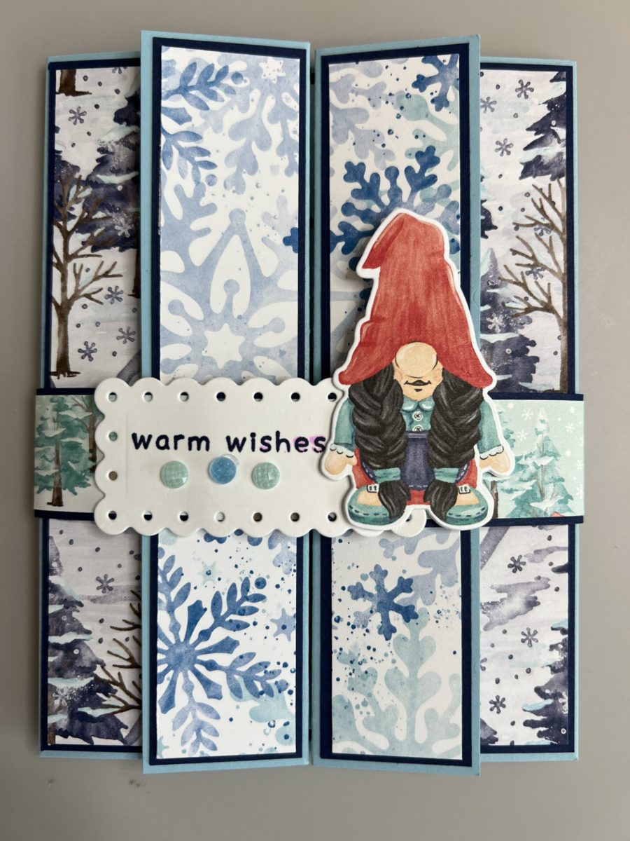 The Stampin’ Up! Kindest Gnomes are adorable characters. The one looked so cute on the band to this Kindest Gnomes Gatefold Card, who can resist such an adorable card. I would have to think that the person who receives this Christmas Card will know how special they are to you. I’ve made lots of standard Gatefold cards in the past but never a double fold one like this. It’s fun to see what you have pictured in your mind actually come to life and you like the way it turned out. It’s also nice that Stampin’ Up! makes Designer Series Paper that you can out with coordinating dies. The Stampin’ Up! Paper Trimmer also has a score blade on it or you can use a Score Board for all the scoring on this card. I hope you enjoy this card and video.