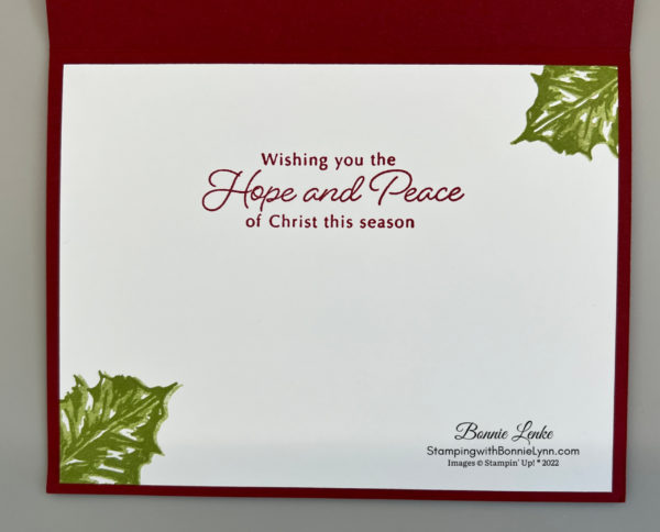 - For the inside I stamped the saying from the Hope & Peace stamp set in Cherry Cobbler Ink onto White Cardstock. Using the Leaves of Holly stamps and Old Olive Ink I inked up the smaller of the two solid leaves stamps and stamped off once and then stamped in the lower left corner of the White Cardstock, repeat for the upper right corner. Using the detailed smaller stamp and Old Olive Ink stamp over the solid leaf. Adhere Cardstock with your favorite Adhesive.