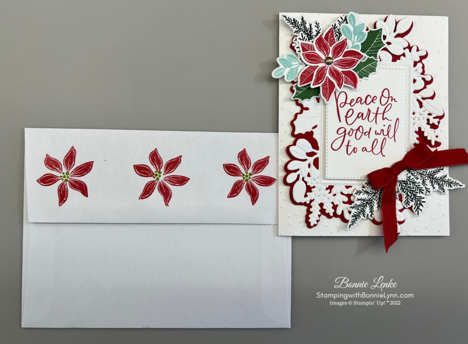 - Finish the Envelop with a Poinsettia stamped in Real Red Ink on the lower left side. I stamped the dot centers on the poinsettias in Granny Apple Green Ink. On the envelope flap either stamp more poinsettias or add Boughs of Holly Designer Series Paper to it.