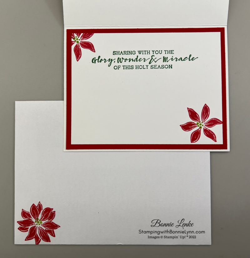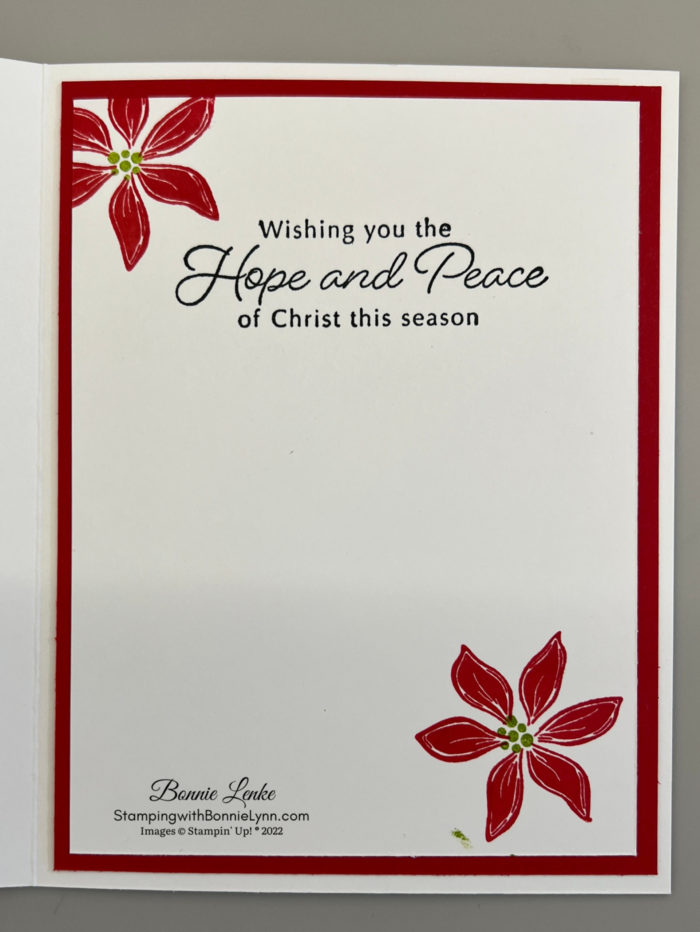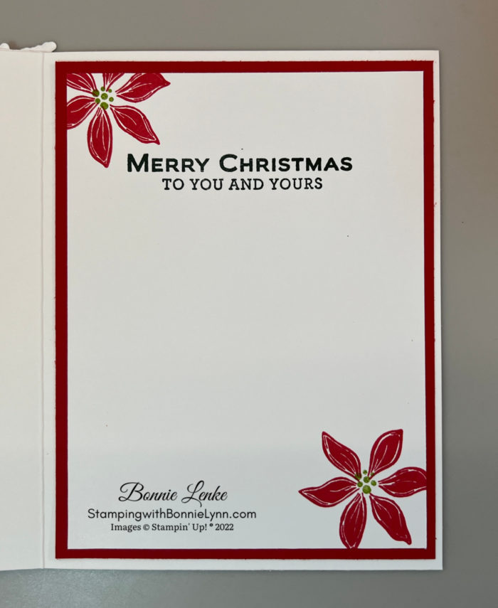 - The inside of card was finished with the saying stamped in either Garden Green or Evening Evergreen Ink. The Poinsettias were stamped in Real Red Ink.