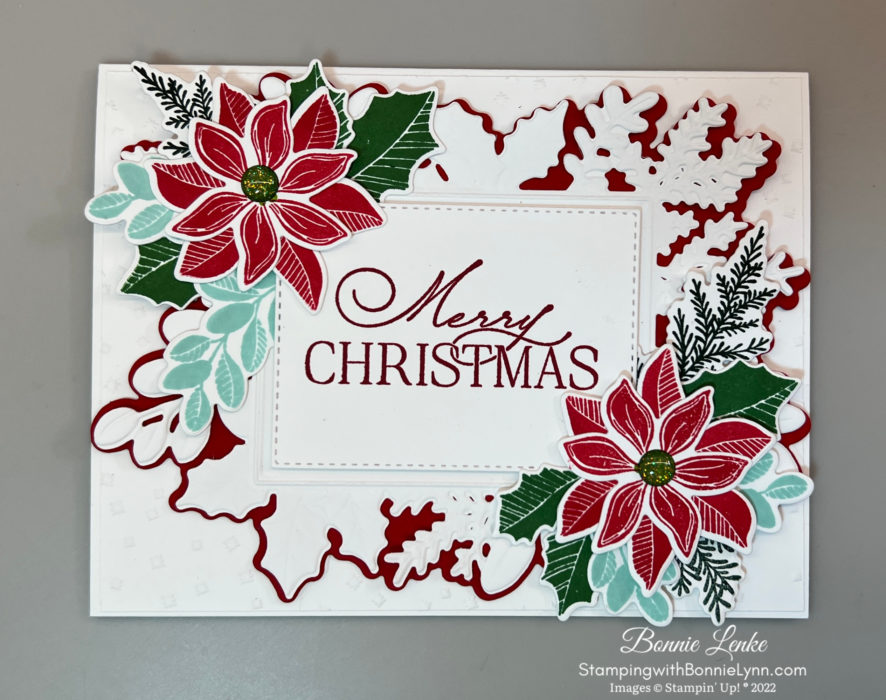 - The Pointsettia’s where stamped in Real Red Ink, Boughs in Pool Party Ink, Pine Branches in Evening Evergreen and Holly in Garden Green Ink. Die cut each item with the coordinating dies.