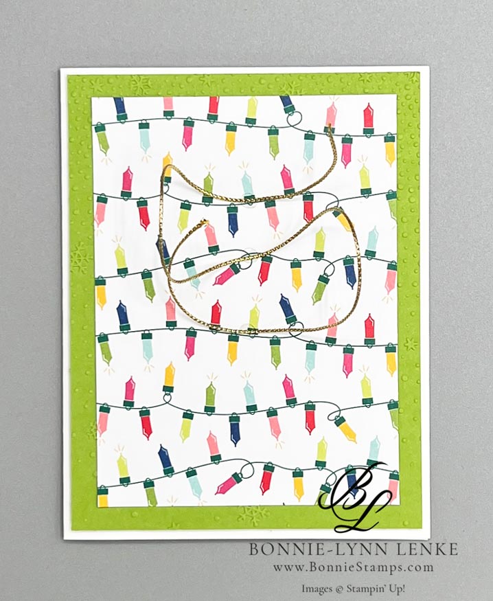 - Take the Merry, Bold & Bright Designer Series Paper and adhere to Lemon Lime Twist. Use Dimensionals to add this combo to card base.
