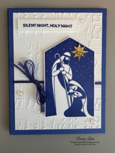 There is nothing more beautiful to me than to give or receive at Christmas than a card that represents the true meaning of Christmas. The Peace to You Stamp Set from Stampin’ Up is that card this year. Just stamping the main stamp, adding a star and doing a simple background is the perfect Christmas Card to me. The greeting that comes with this set, “Silent Night, Holy Night”, holds a special meaning to me too. It was my son’s favorite bedtime song when he was really young and I had to sing it to him every night. It was then my granddaughters and grandsons’ favorite bedtime song too. I hope you enjoy the simple elegance of this card.