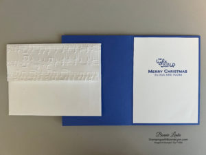 - For the card inside I used the Peace to You stamp set to stamp “The light of the world” stamp in Orchid Oasis Ink onto White Cardstock. The “Merry Christmas to you and yours” stamp if part of the Christmas Barn stamp set. Adhere to card inside. There is also a new Stamp Set “Hope & Peace” that is perfect to go with this card (I forgot to order it at the same time).