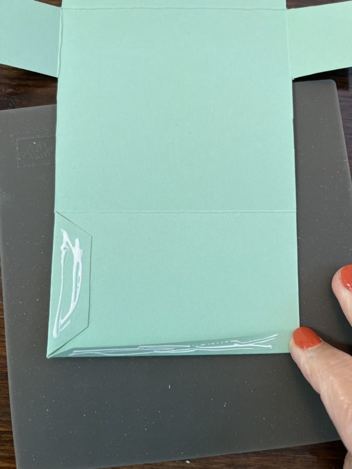 What Cut Cardstock is to look like after cutting it. - Fold the Tab on the top side over and glue down. Fold the top tab over and put the glue on the outside of tab (you do not want to glue the tab closed as a gift card needs that extra space under it) and also apply glue on the top of the side tab, fold this section over on the score line to glue to section below it.