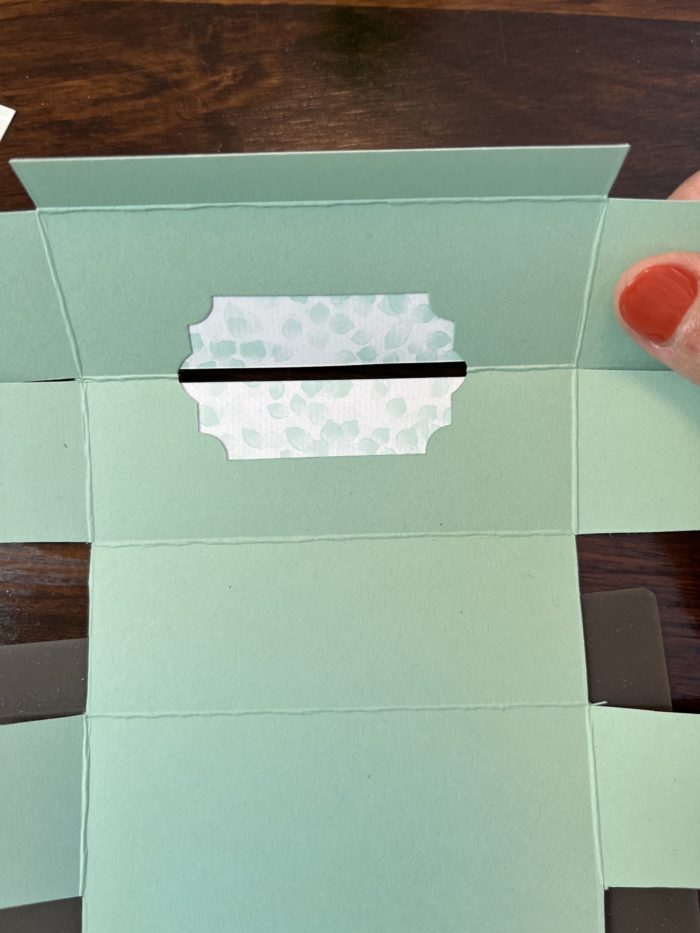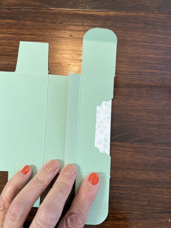 - Add the Designer Series to the two sections you just punch, the side tabs and the top front. Hint: I found it was easier to add the Designer Series Paper while the box was not yet assembled.
