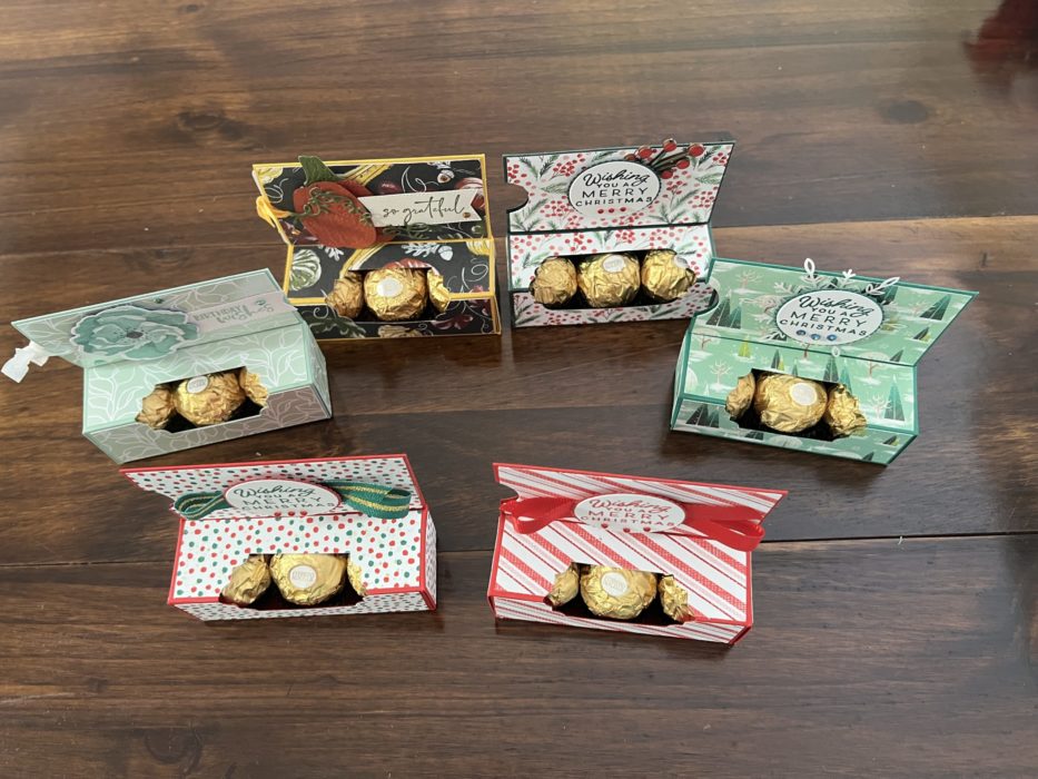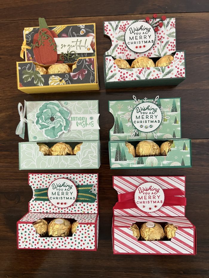 I’m listing all the supplies I used for the 6 different boxes that are shown in the picture. The bottom two boxes are from the same DSP. Ribbons are retired ribbons and I don’t know the name of the punch, it also is retired. The items for the Rustic Harvest are listed first and the one that was done in the video.