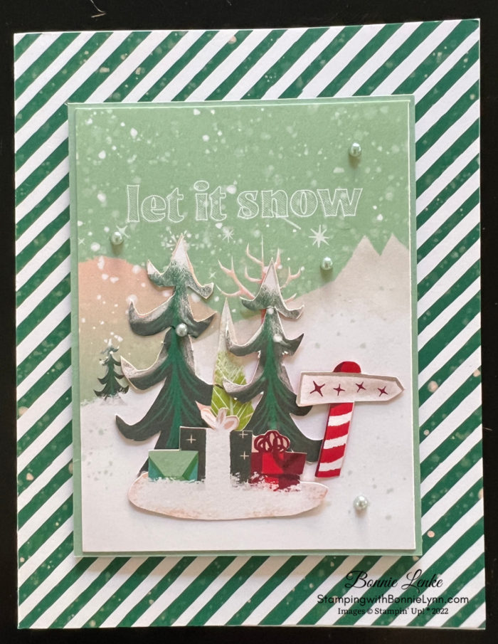 I started with a piece of Basic White Cardstock 8-1/2” x 5-1/2”. Score at 4-1/4” and fold on score line, burnish with Bone Folder. Add panel, 4-1/4” x 5-1/2” of the striped Santa Express DSP to card front. Using the Santa Express Memories & More Card Pack, cut a “let it snow” panel so it’s 3” x 4”, (cut in half width and trim a 1/4” from the top or bottom of the panel). Adhere it to Mint Macaroon Cardstock 3-1/8” x 4-1/8”. Adhere to card front with Dimensionals. Fussy cut the trees, gifts and red/white pole out of the Santa Express DSP and adhere to card front with Glue Dots. Add Festive Pearls to card front. Stamp a saying on the card inside. Add a piece of matching DSP to Envelope Flap.
