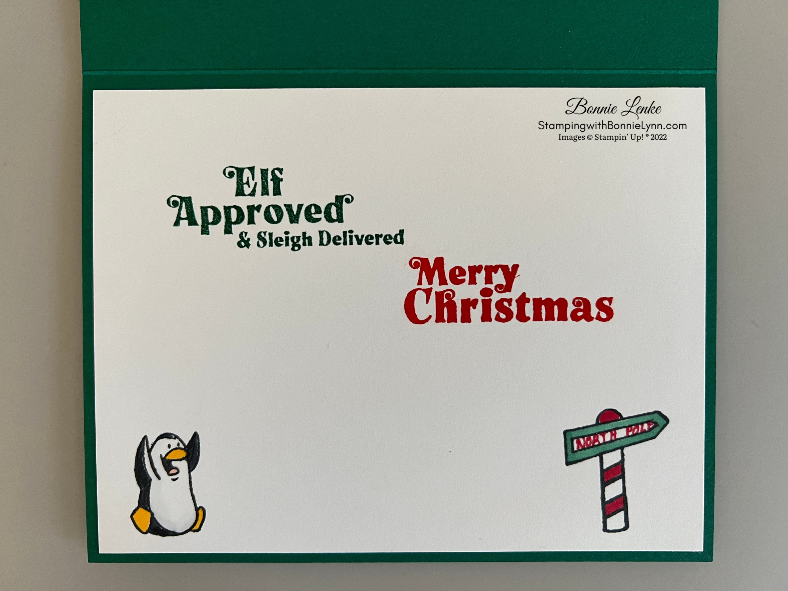 - For card inside I stamped to greetings, one in Shaded Spruce and the other in Poppy Parade. I also stamped a penguin and sign in Black Memento Ink and then colored them. I hand wrote “north pole”.