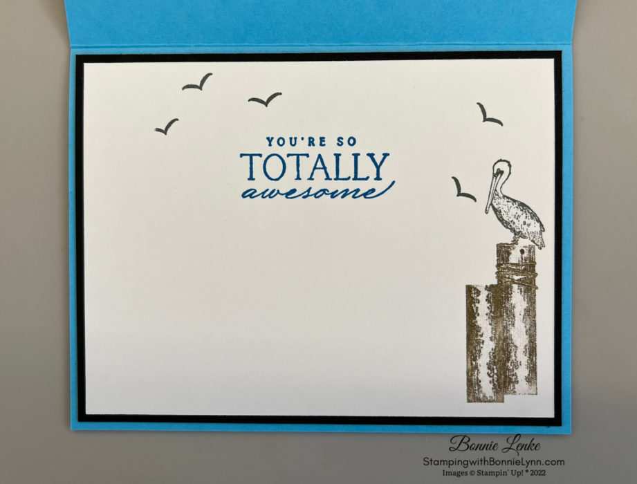- For the inside I stamped the Saying in Pacific Point Ink onto White Cardstock. Stamp the pelican on a piling with a combination of Soft Suede for the piling and Smokey Slate Ink for the pelican. Ink the stamp up using Daubers. Adhere to Black panel and then to Tahitian Tide panel. Adhere to card inside.
