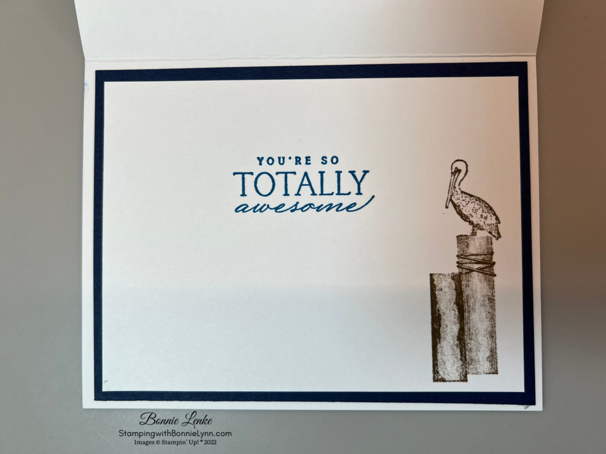 - For the inside I finished it by stamping the saying in Night of Navy Ink onto White Cardstock. Stamp the seagull sitting on the logs in Soft Suede Ink. Adhere this to the Night of Navy Cardstock then adhere the panel to the card inside.