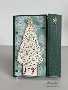 - Adhere the Gold Emboss Christmas Tree to the card front, centering it on your Joy tree stump with Dimensionals.