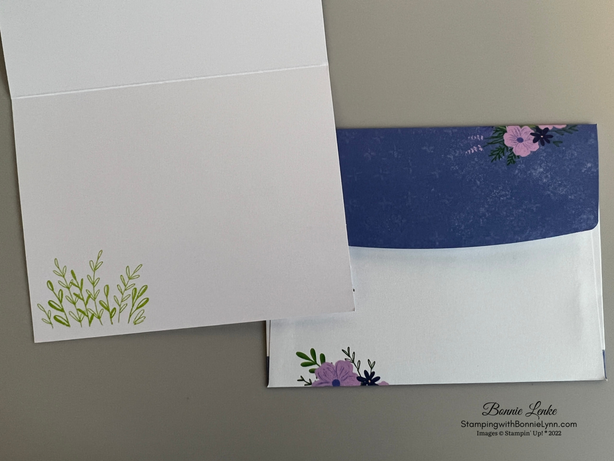- Stamp the inside bottom with greenery stamp in Parakeet Party Ink. Stamp a sentiment, if desired, in Orchard Oasis Ink.